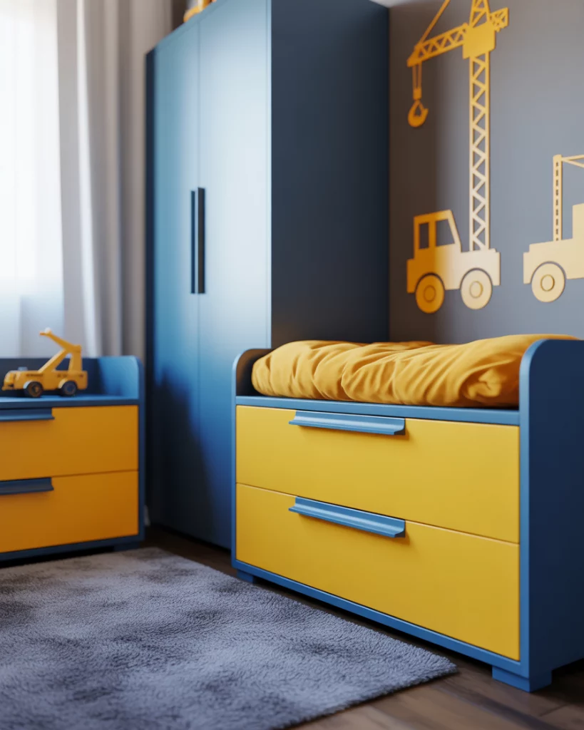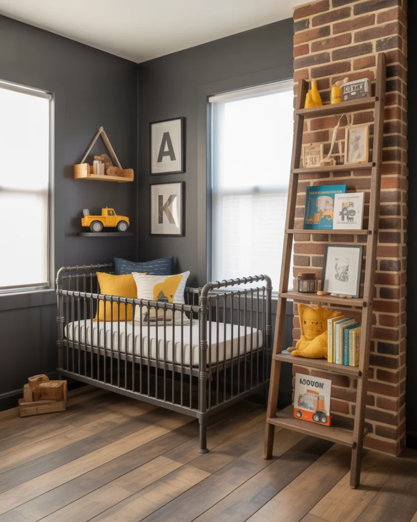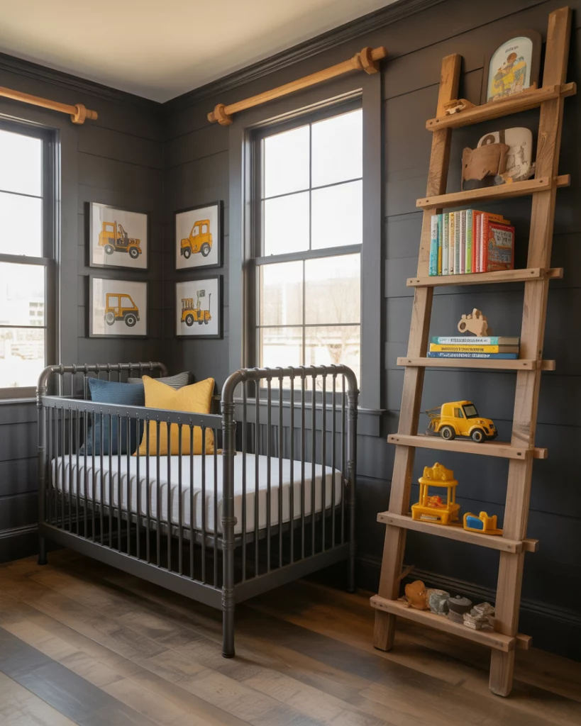 For parents who appreciate the beauty of hard work and machinery, a construction-inspired nursery with a rustic loft feel hits the mark. Use neutral cement grey walls, metal shelving, and pops of yellow and blue. The nursery can feature a black crib and industrial lighting or an upcycled ladder shelf. It’s edgy, urban, and surprisingly cozy.