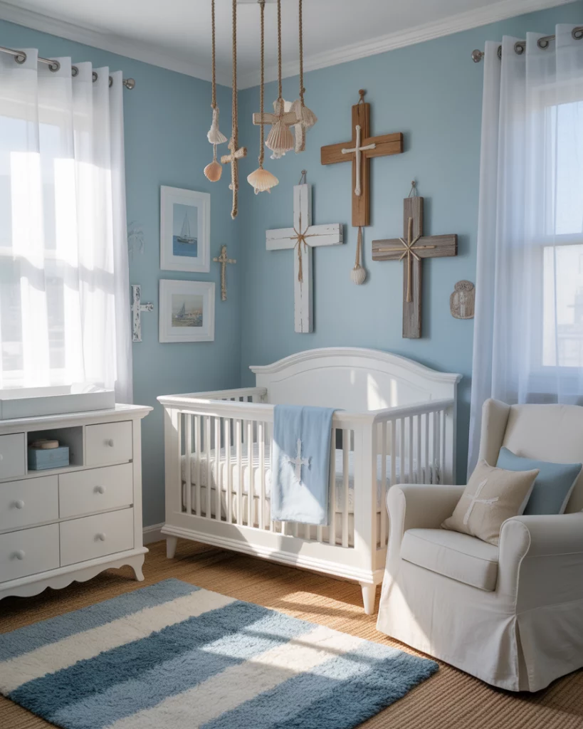 Blend faith and calm in a Christian coastal nursery boy design. Opt for white furniture, blue hues, and linen drapes for a light spiritual ambiance. Add scripture prints in soft fonts, and use small homemade crosses or angelic patterns. The room can exude serenity—as if from an ocean getaway, plus sanctuary—for praying at bedtimes and basking in sunrise lights.