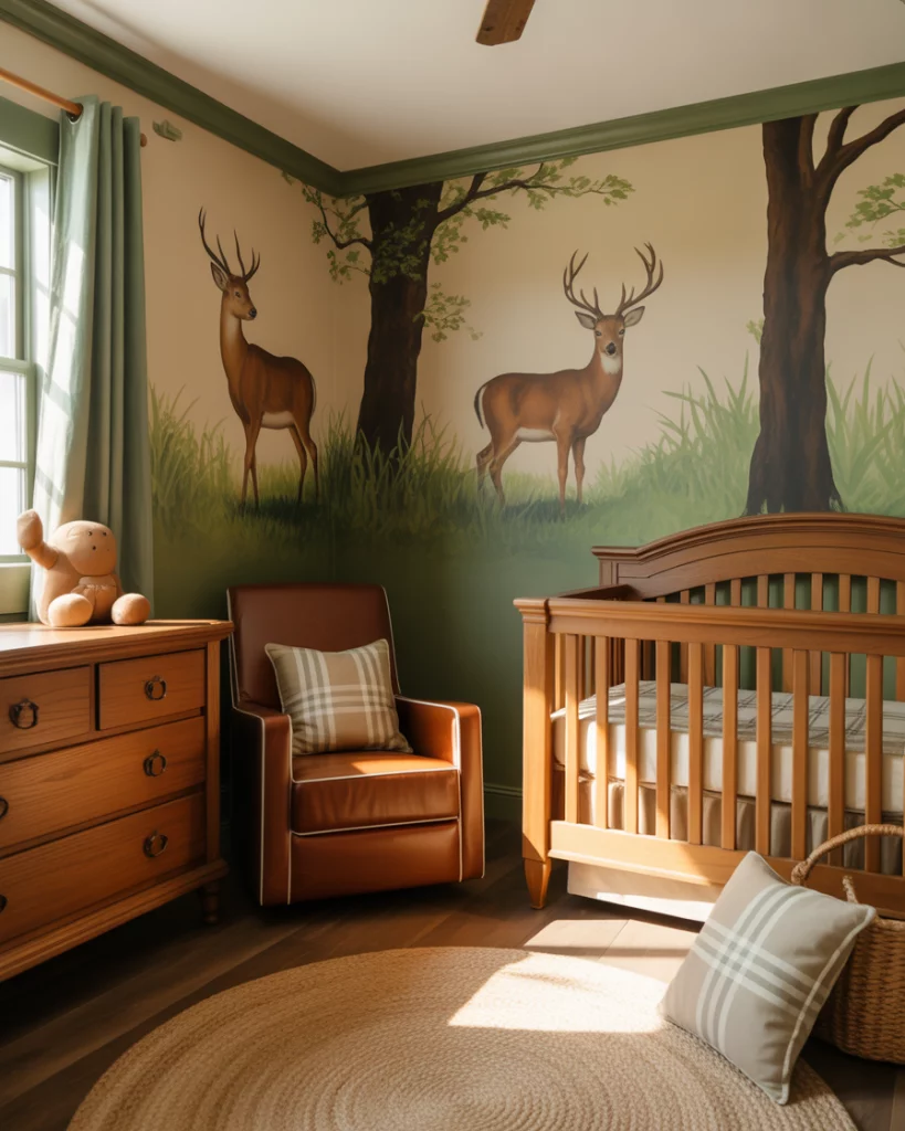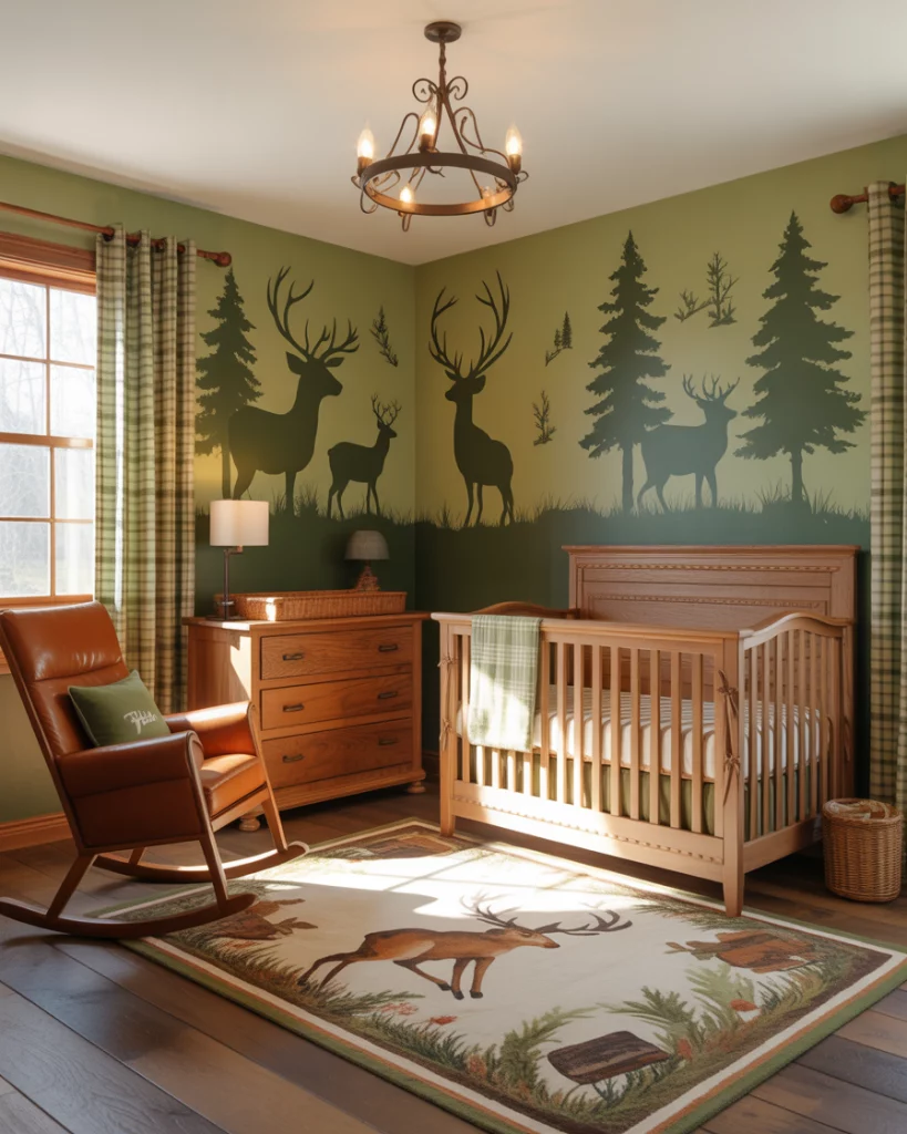 For parent pairs that favor ‘nature,’ ‘outdoor,’ or ‘vintage thrift’ décor, a ‘hunters’ theme featuring deer will look fantastic. Note: Choose warm wall tones of green or taupe, add subtle antler prints (mounted faux deer head), a comfy leather-style rocker, and a personalized carved crest above the crib. Incorporate rugged texture—wool blankets and plaid cushions—while balancing it with clean lines for a modern feel.