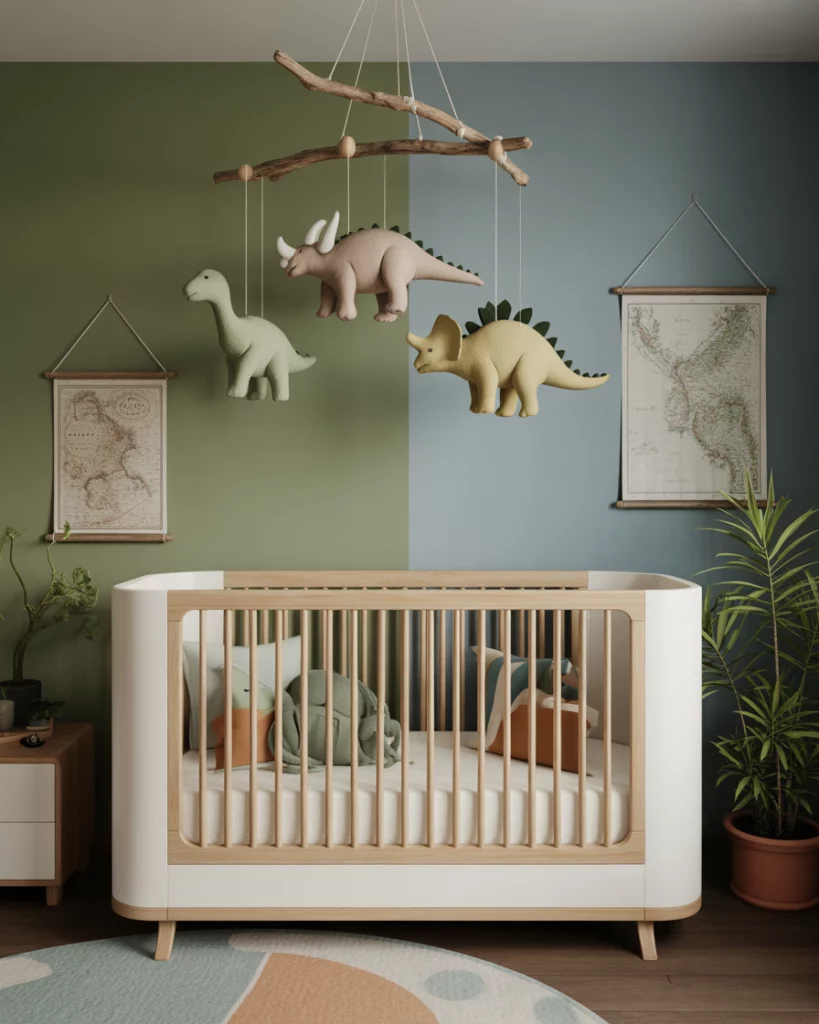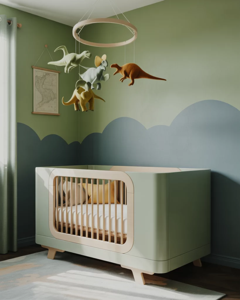 Nothing says childhood excitement quite like a dinosaur-themed nursery—especially when it’s done with elegance rather than chaos. Go for a palette of sage green, dusty blue, and charcoal on accent walls; add framed illustrated dinos and a minimal crib (either white or black) with modern legs. Consider a handmade felt prehistoric mobile above the bed transforming as your child grows. The mix of playful imagery with sleek furnishings keeps the space age-proof.