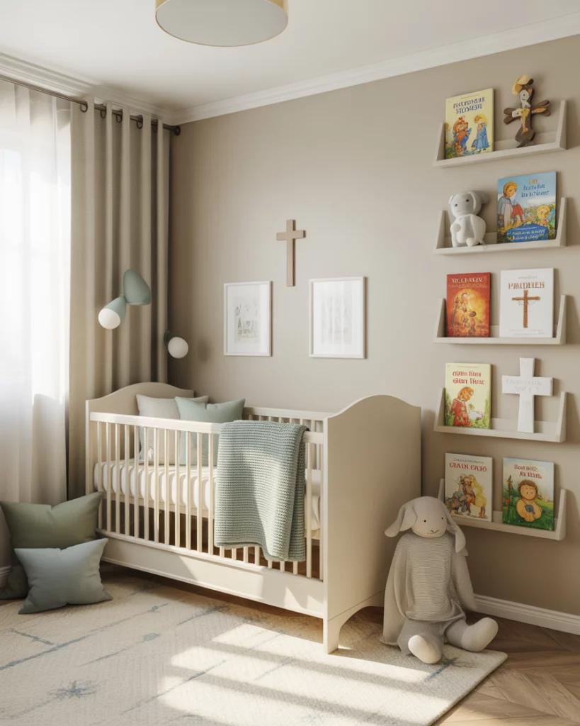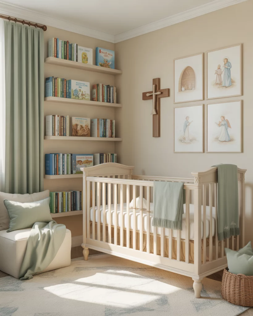 For parents who wish to build faith and meaning into the nursery from day one, a Christian-themed room can feel deeply personal and calm. Use a neutral base (soft grey or cream) and add touches of green or blue, a classic white crib, and storybook shelves featuring faith-based literature. A handmade wooden cross, a personalized name sign, and subtle nature accents (olive branches, soft deer) lend warmth. The goal: a peaceful place for lullabies, prayers, and memory-making.