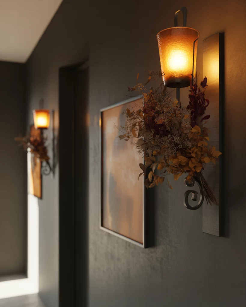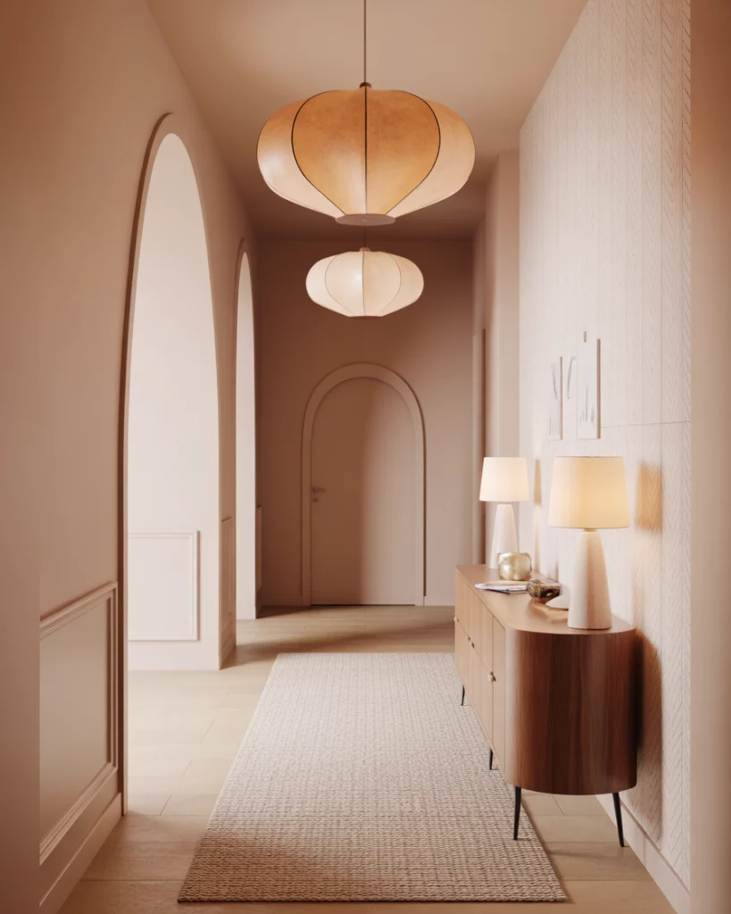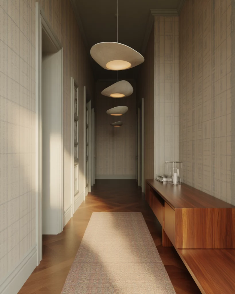 Turning a slim pass-through into a feature is easy with sculptural lighting, especially in a Large home where fixtures help define the Entry. Pairing warm metals with a soft-toned wallpaper or painted wall adds dimension without crowding the walkway. Many U.S. homes rely on hall lighting to create warmth during shorter winter days, making statement fixtures both decorative and practical.