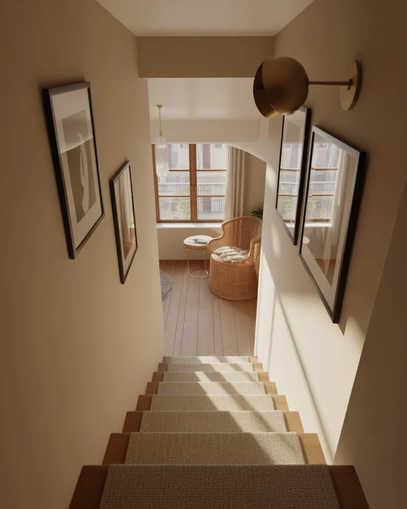Where a hallway meets a Stair, thoughtful décor helps bridge levels gracefully. Soft runners, framed pieces, and a wall sconce can unify the upstairs and lower floors. This works especially well in Home layouts with open landings. In multilevel U.S. homes, stairs often function as informal display zones—blending them with hall décor creates smoother visual continuity.
