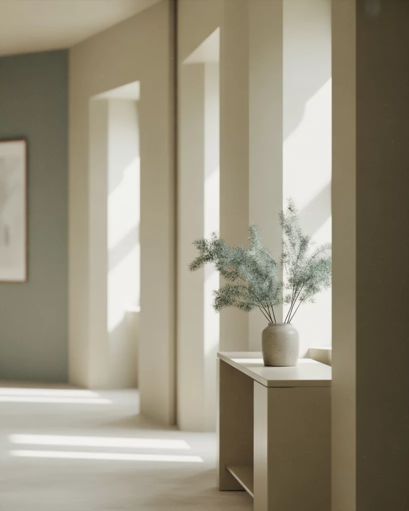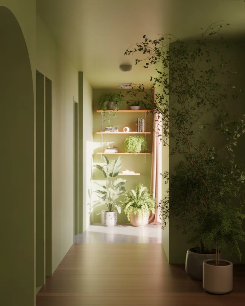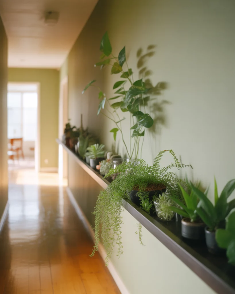 A hallway with soft greenery instantly feels more welcoming, especially in a Narrow space where natural elements soften edges. Add a slim shelf or table for small plants and pair it with light colours to brighten the Entrance without crowding the path. Homes with limited daylight benefit the most—plants near brighter sections help visually lift the entire corridor.