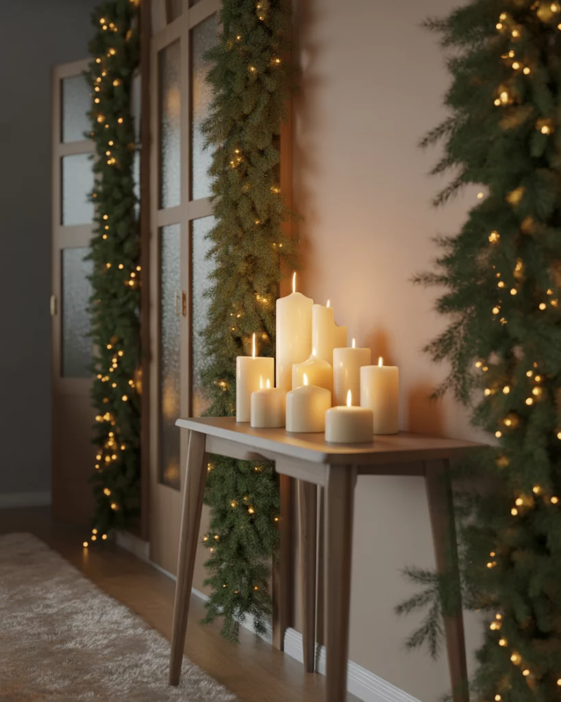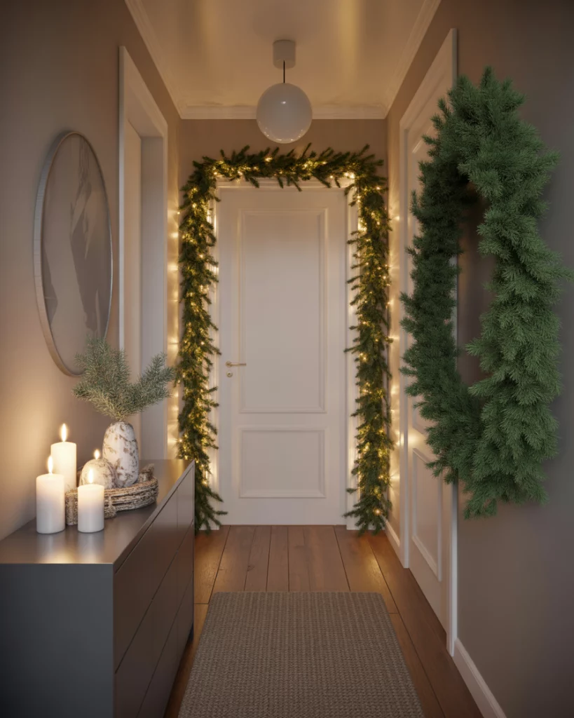 A hallway can portray a softly lit, textured winter wonderland, and it is then not overly seasonal. To keep it textured and calm, stick to softer, pale, and frosted colors, and then make it timeless with a simple, serene winter tabletop vignette at the entry. A homeowner remarked that soft winter décor adds an emotional warmth to the space, even without the lighting change.