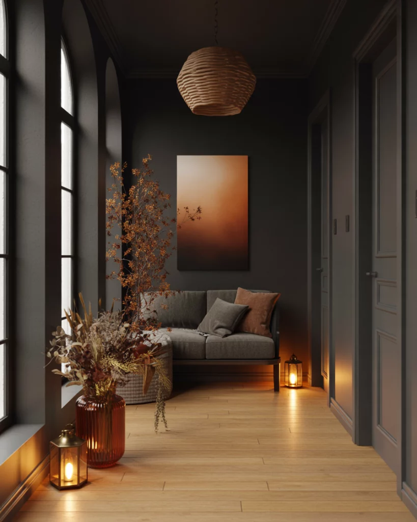 A hallway that leads to a bedroom can become a seasonal moment for Halloween. It can be decorated with a palette of muted orange and dark woods for a short vignette with lanterns. That is enough to give the upstairs a hint of spooky charm. A homeowner said her kids were asking for “just one spooky thing” so she hanged a single moody print, and to her surprise, it became the favorite hallway feature for the whole family.