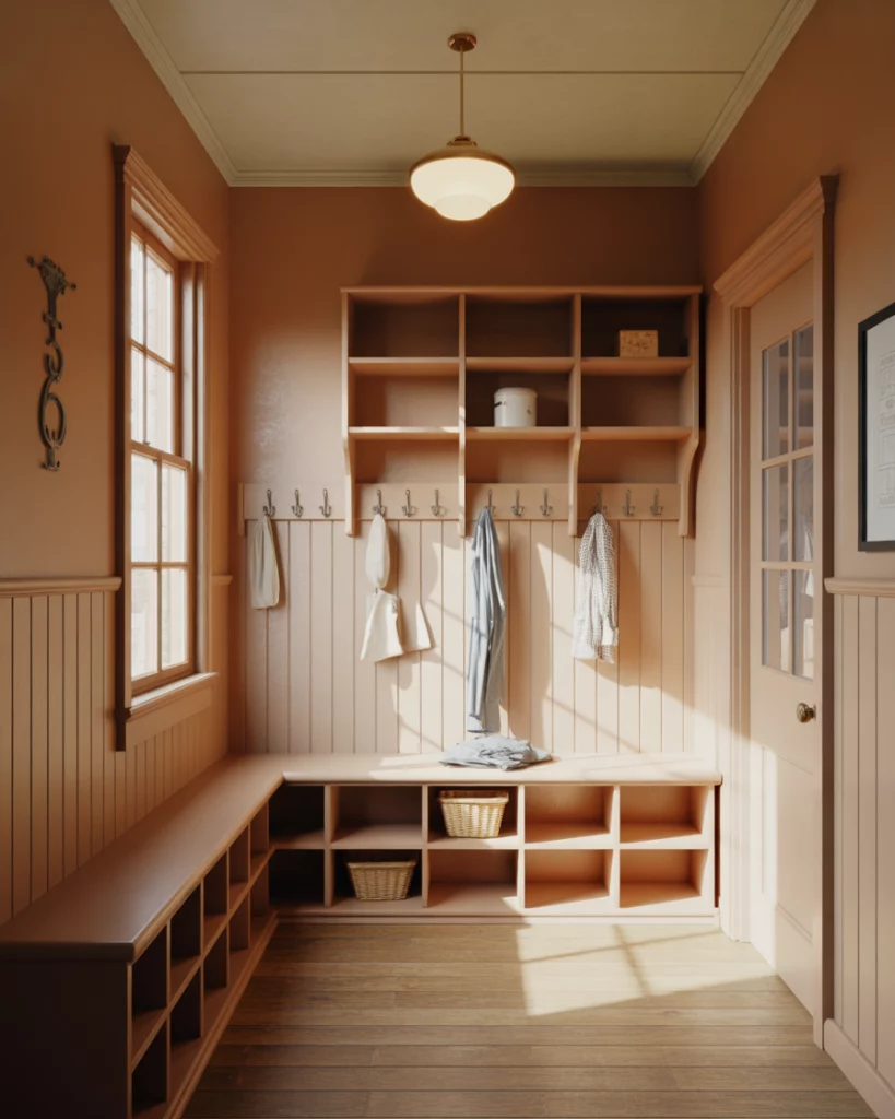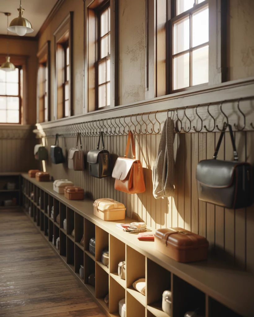 Vintage charm shines in hallways inspired by classic School design. A soft chalky palette, labeled baskets, and simple hooks echo Christmas school nostalgia. This idea also suits families rushing kids To school from an upstairs landing each morning. Using identical baskets and simple labels reduces morning stress, especially in busy households juggling homework, coats, and quick exits.