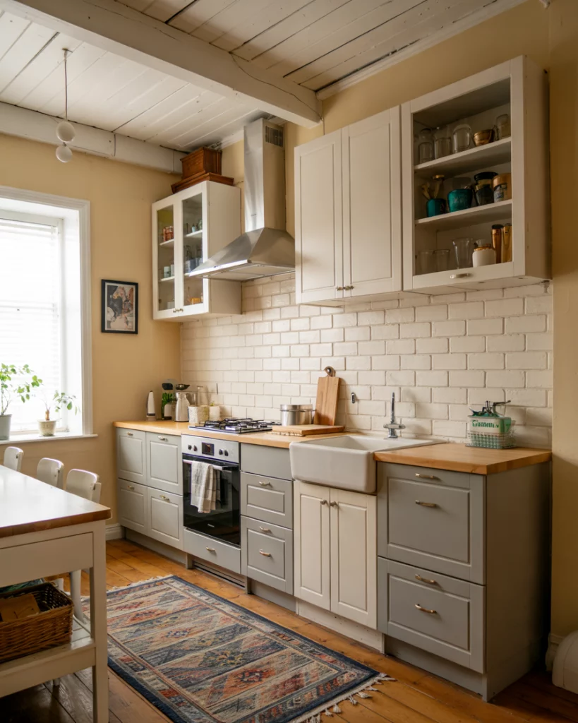 Classic but reimagined, this idea uses white cabinetry—often on the main run or the upper section—then adds warmth via wood or brass details. The white provides a light, airy backdrop, ideal for small spaces or small kitchen areas, while the warmth prevents the space from feeling sterile. I once helped a newlywed couple pick cabinets for their 800 sq ft condo; choosing a soft white base with oak lower doors made the kitchen feel larger and more inviting. This style remains timeless in a 2026 remodel.