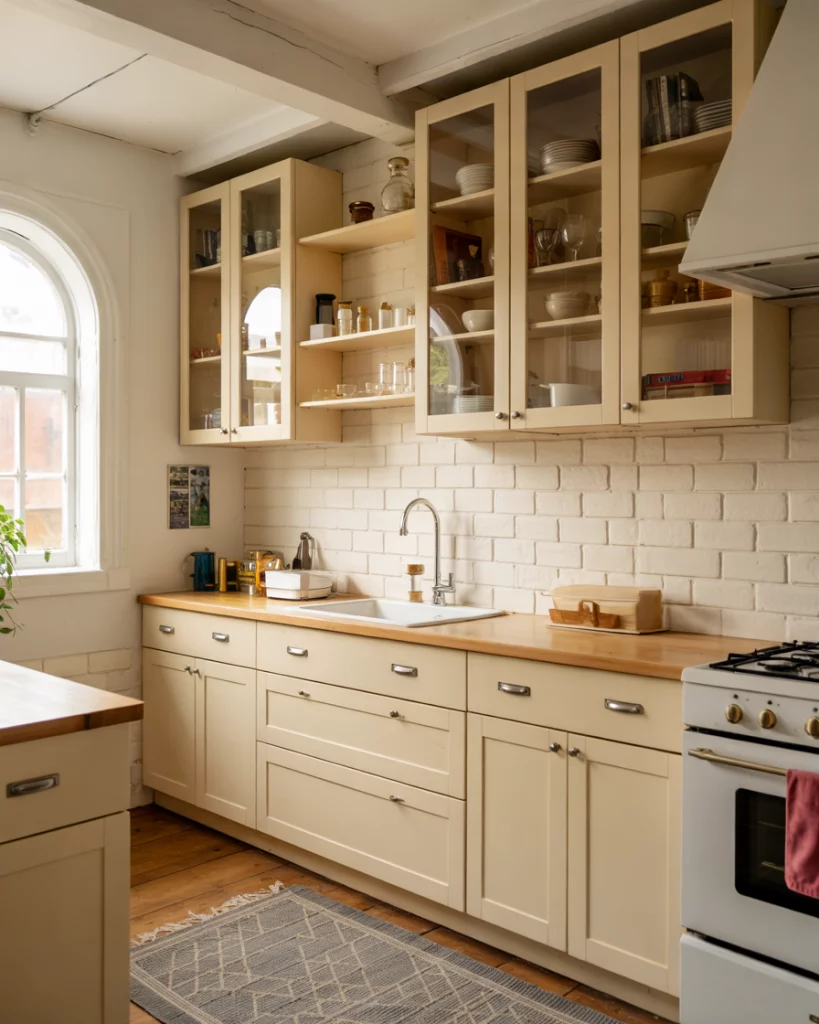 Lightweight and stylish, metal-framed glass upper cabinets are redefining modern kitchens in 2026. They add transparency and balance to heavier base units, creating a sense of open space. I remember seeing this setup in a downtown loft—the reflective surfaces made even a small kitchen glow with daylight. Mixing black or brass frames adds a hint of industrial tone while keeping the look airy and sophisticated.