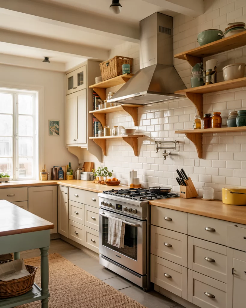 As fully open shelving falls out of favor in serious remodels, a hybrid approach is trending: partial cabinetry paired with a few open shelves for display. This gives you enclosed storage for essentials and visible space above for decorative pieces or cookbooks. In a busy family home I visited, the open shelves above the side of the main cabinet held bowls and plants, while the closed cabinets below hid clutter—offering the best of both worlds. It’s a smart approach for those who want style without sacrificing organization.