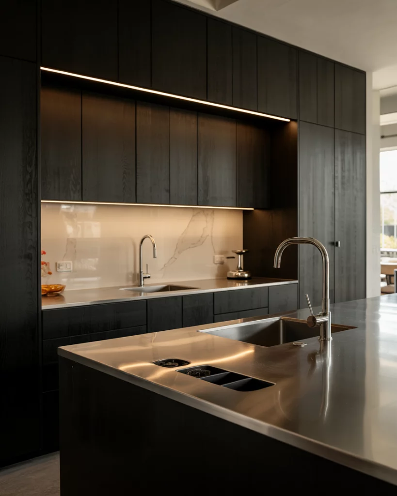 Embracing a dramatic look, this idea features black cabinet fronts—whether the upper or lower units—in a sleek, modern kitchen design. Paired with lighter countertops, wood accents, or matte hardware, black cabinets anchor the space and bring depth to the overall design. I noticed this approach when visiting a friend’s urban loft: the black island cabinetry made the whole place feel more grounded yet stylish. It works especially well in medium-sized kitchens where you want a focal point without overwhelming the room.