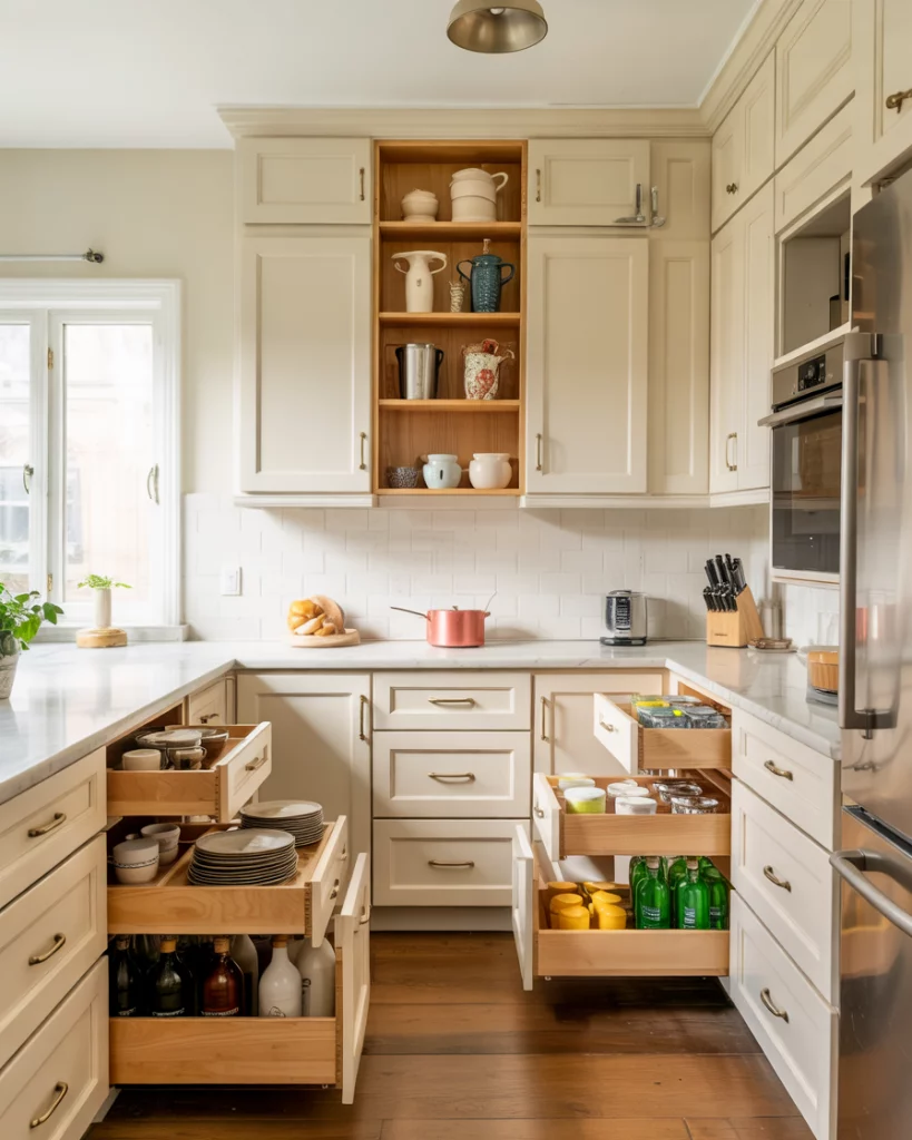 Beyond appearance, one of the smartest ideas centers on the inside of cabinetry: pull-out organizers, corner solutions, appliance garages, and hidden drawers beneath base cabinets or in the bottom corner unit. In my research, many homeowners said these built-in solutions changed how they used the kitchen—not just how it looked. For 2026, cabinetry isn’t just about the doors; it’s about what’s inside and how the layout supports daily living.
