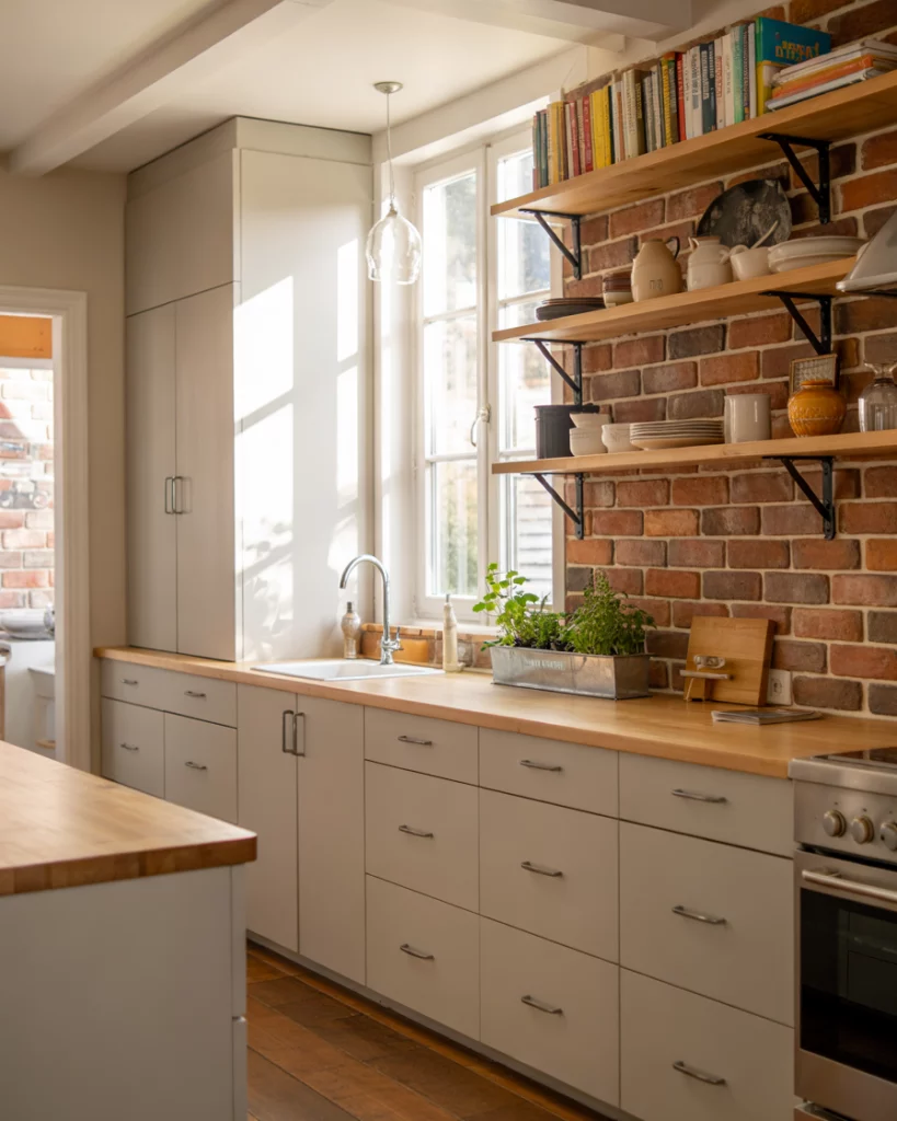 As fully open shelving falls out of favor in serious remodels, a hybrid approach is trending: partial cabinetry paired with a few open shelves for display. This gives you enclosed storage for essentials and visible space above for decorative pieces or cookbooks. In a busy family home I visited, the open shelves above the side of the main cabinet held bowls and plants, while the closed cabinets below hid clutter—offering the best of both worlds. It’s a smart approach for those who want style without sacrificing organization.