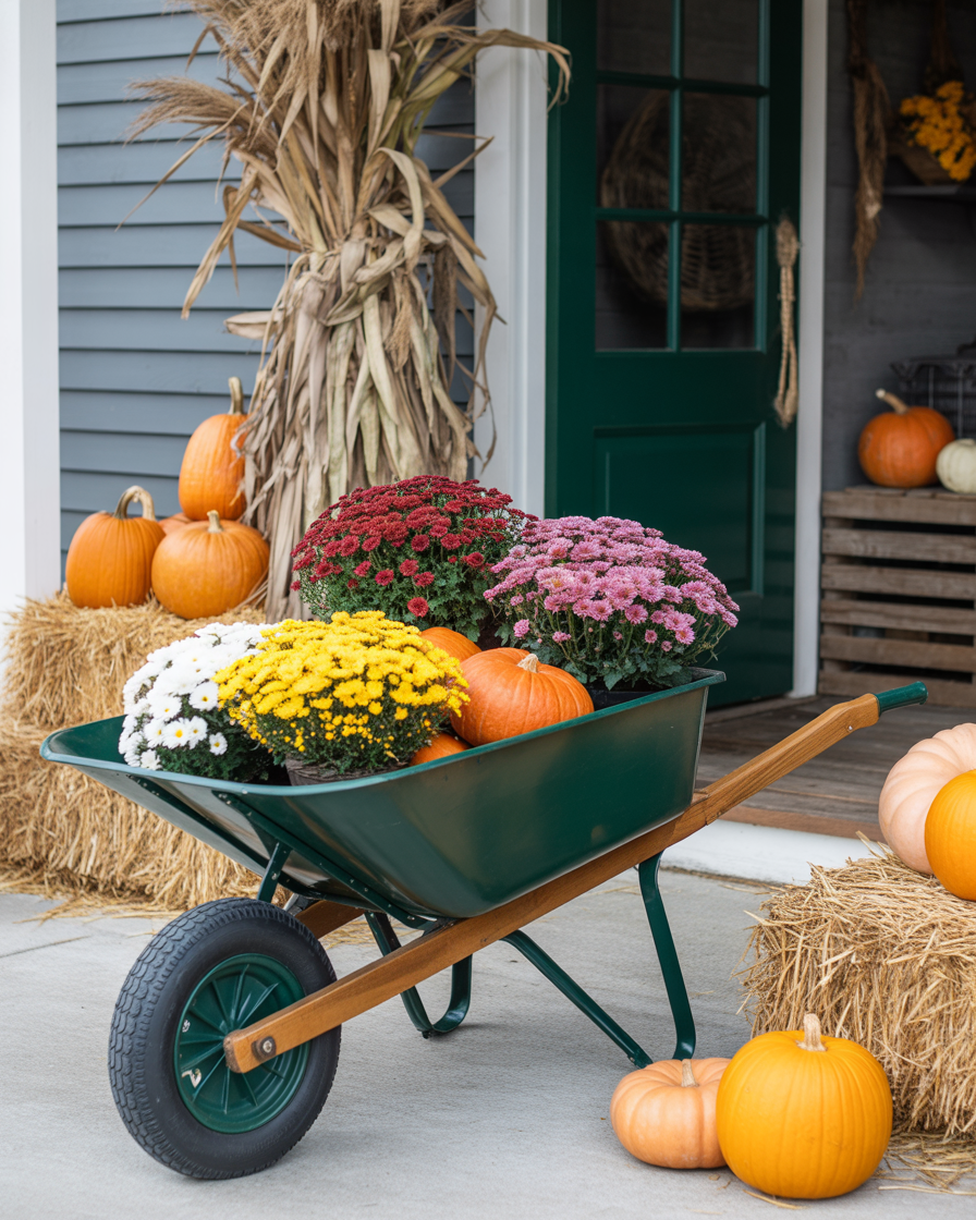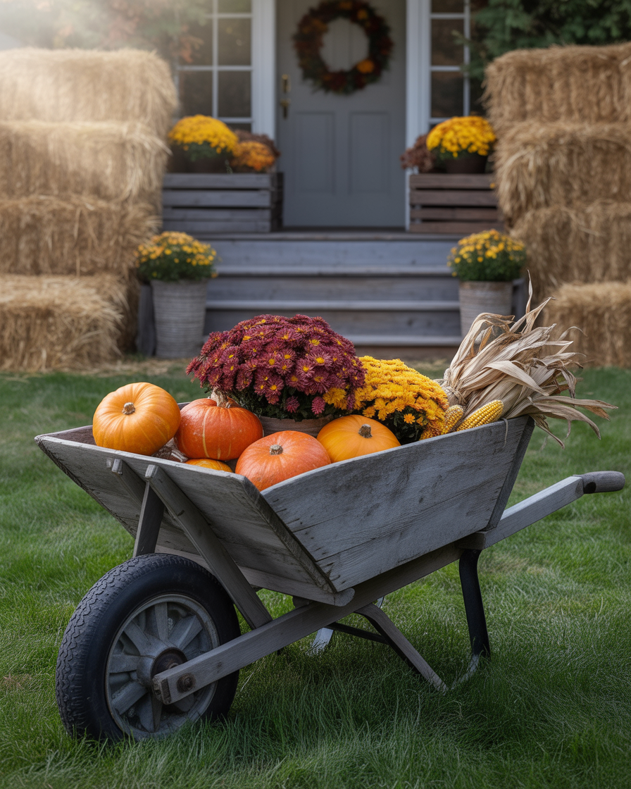 1. Welcoming Fall with a Rustic Wheelbarrow Display
