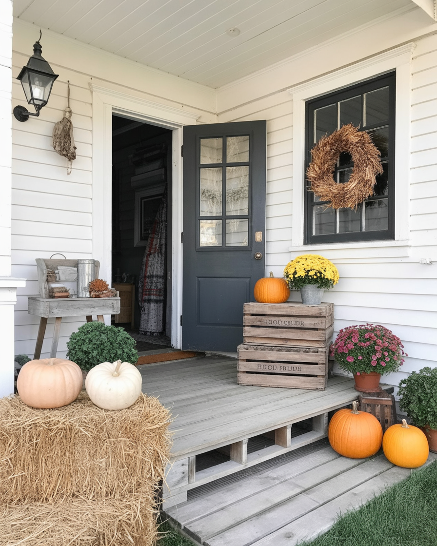 3. Farmhouse Charm with Mums and Pumpkins