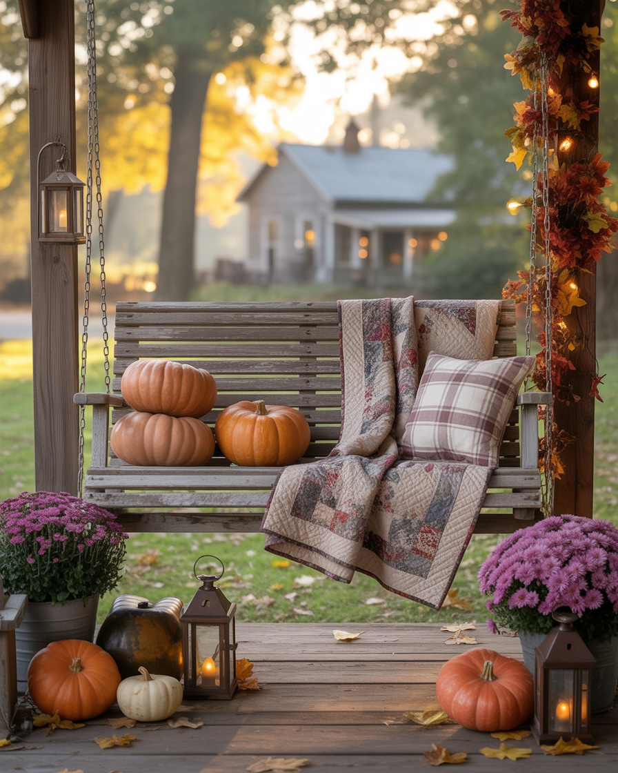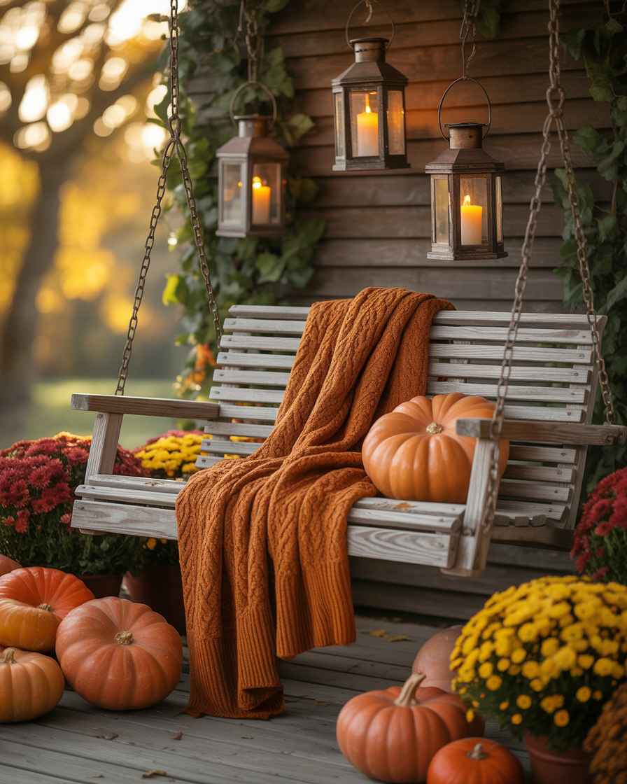 16. Autumn-Decorated Porch Swing with Lanterns