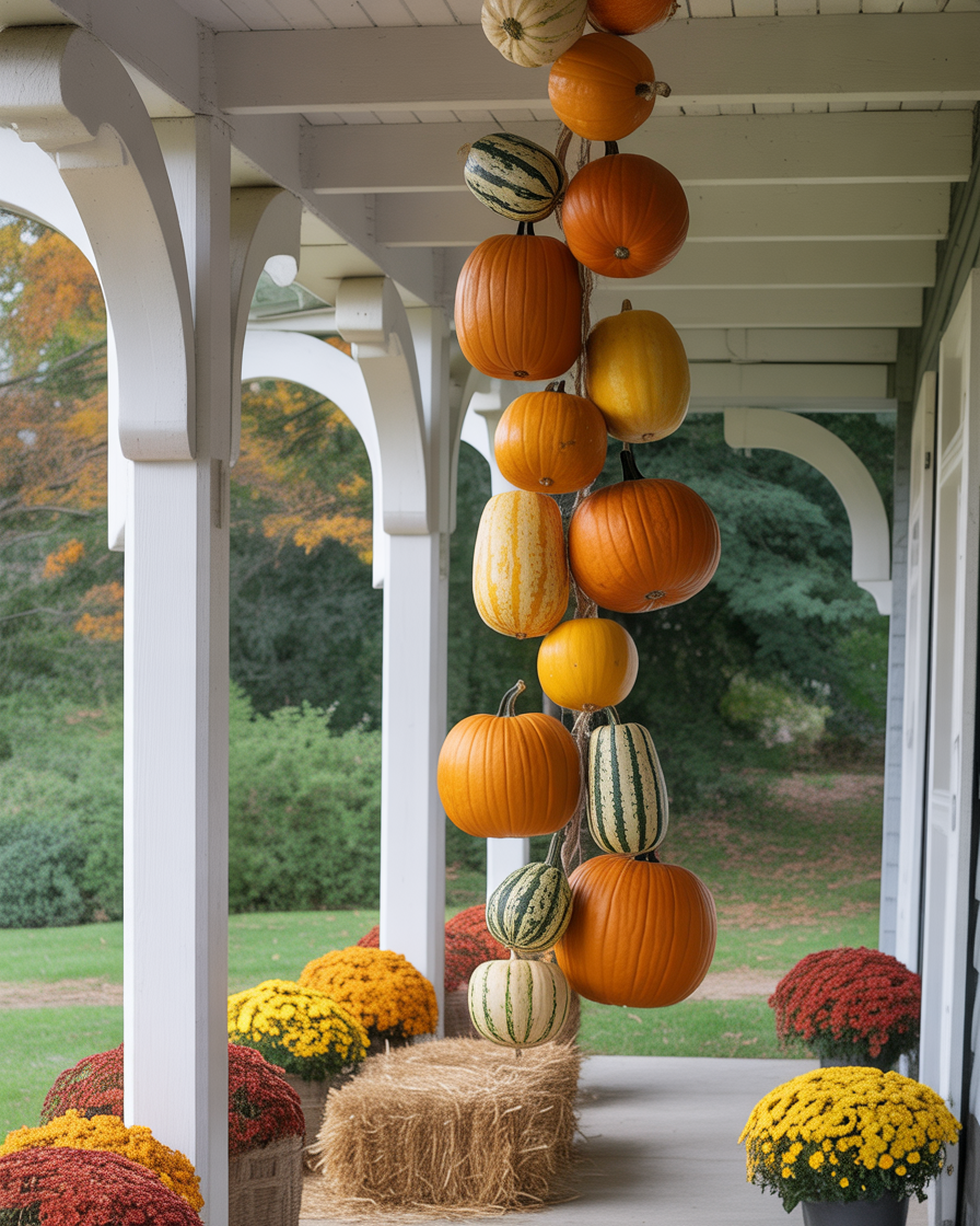 Create a whimsical and eye-catching hanging display of pumpkins and gourds on your porch arch or overhead beams. This concept expounds on the vertical space to introduce fall color and texture without closing off the floorspace to other adornments. On the porch floor, the hanging pumpkins and gourds can be accompanied by small hay bales or mums. This setup will instantly draw attention and give your porch a creative, seasonal flair.