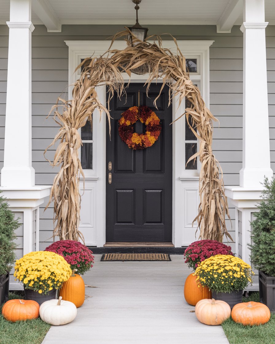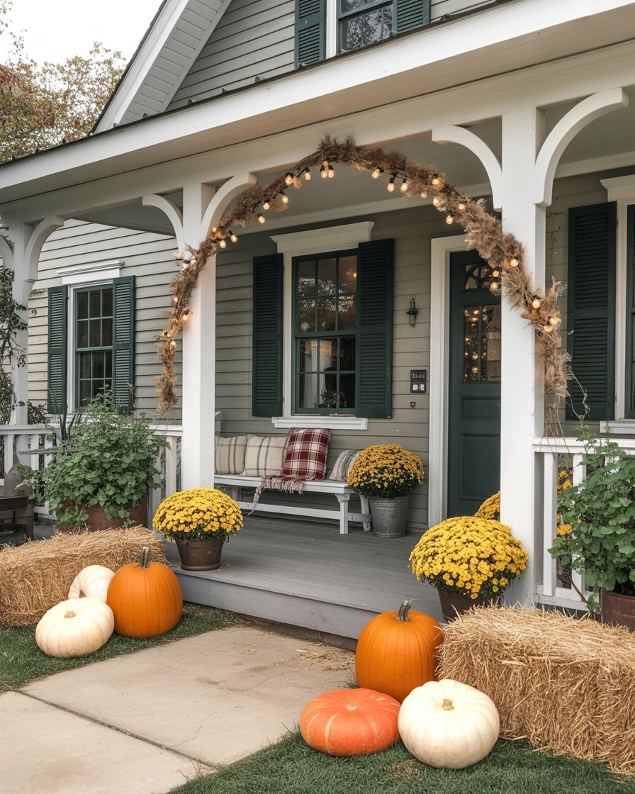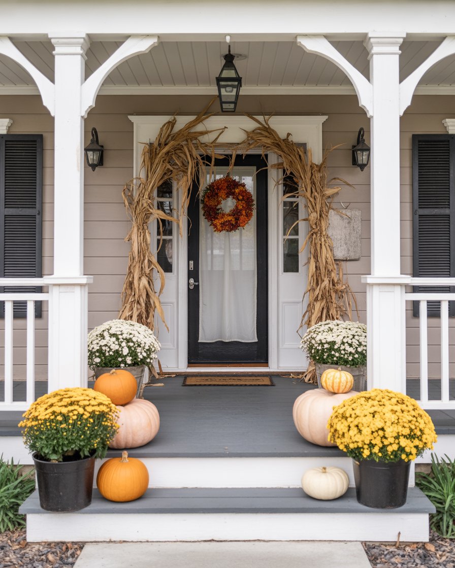 For those who prefer simple elegance, a small front porch can still make a big statement. A few mums of a neutral tone, some pumpkins, and maybe a front porch arch of decoration provided with corn stalks. This updated version of fall decor has fewer items but it still gets into the spirit of the season. The most important thing is that the layout should not be cluttered, but each piece should stand out on its merit. A minimalist approach ensures your outdoor space remains chic while maintaining that cozy autumn feel.