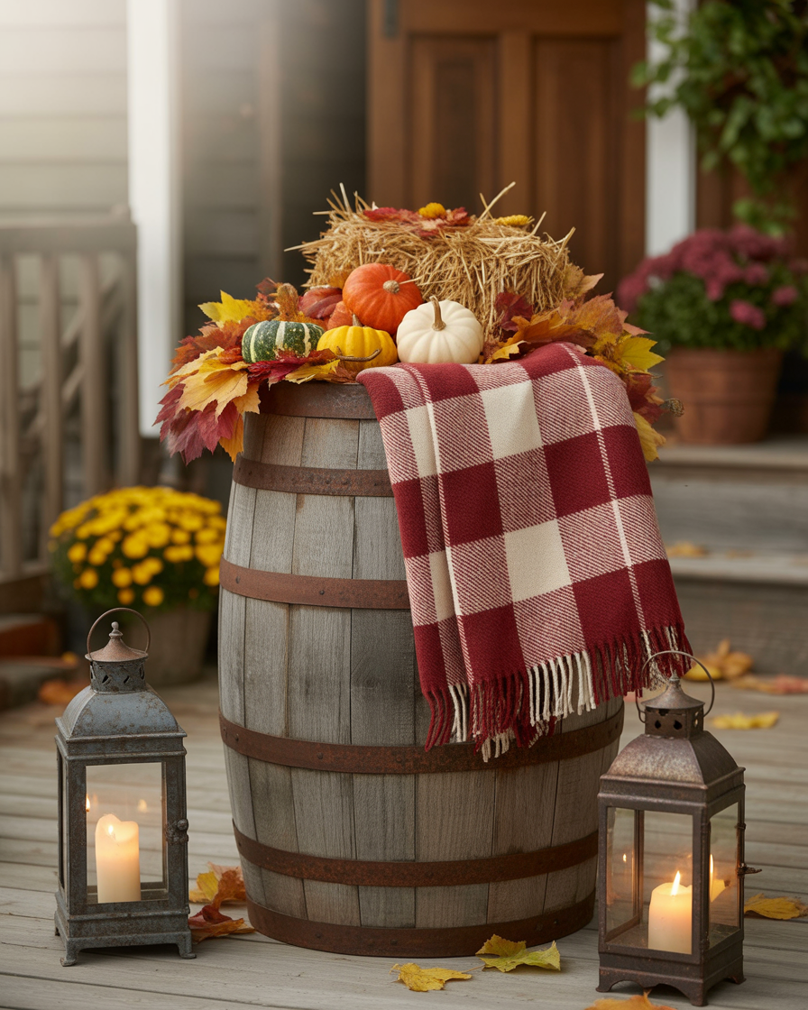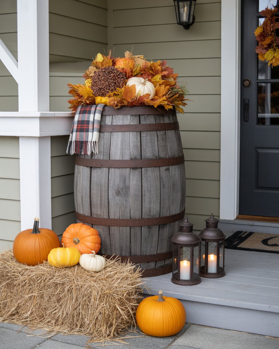 For a charming rustic look, use an old wooden barrel to create a fall display filled with vibrant fall leaves, pumpkins, and even a small stack of hay bales. The barrel gives such a rustic elegance to your front porch, which is complemented by the falling leaves who introduces a little colour and motion in the situation. This setup works beautifully on small front porches, and it can be paired with a plaid blanket or small lanterns to further enhance the cozy vibe of the season.