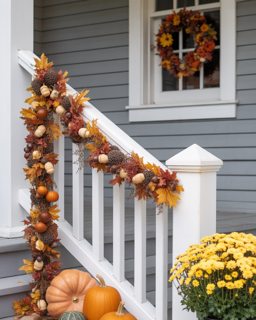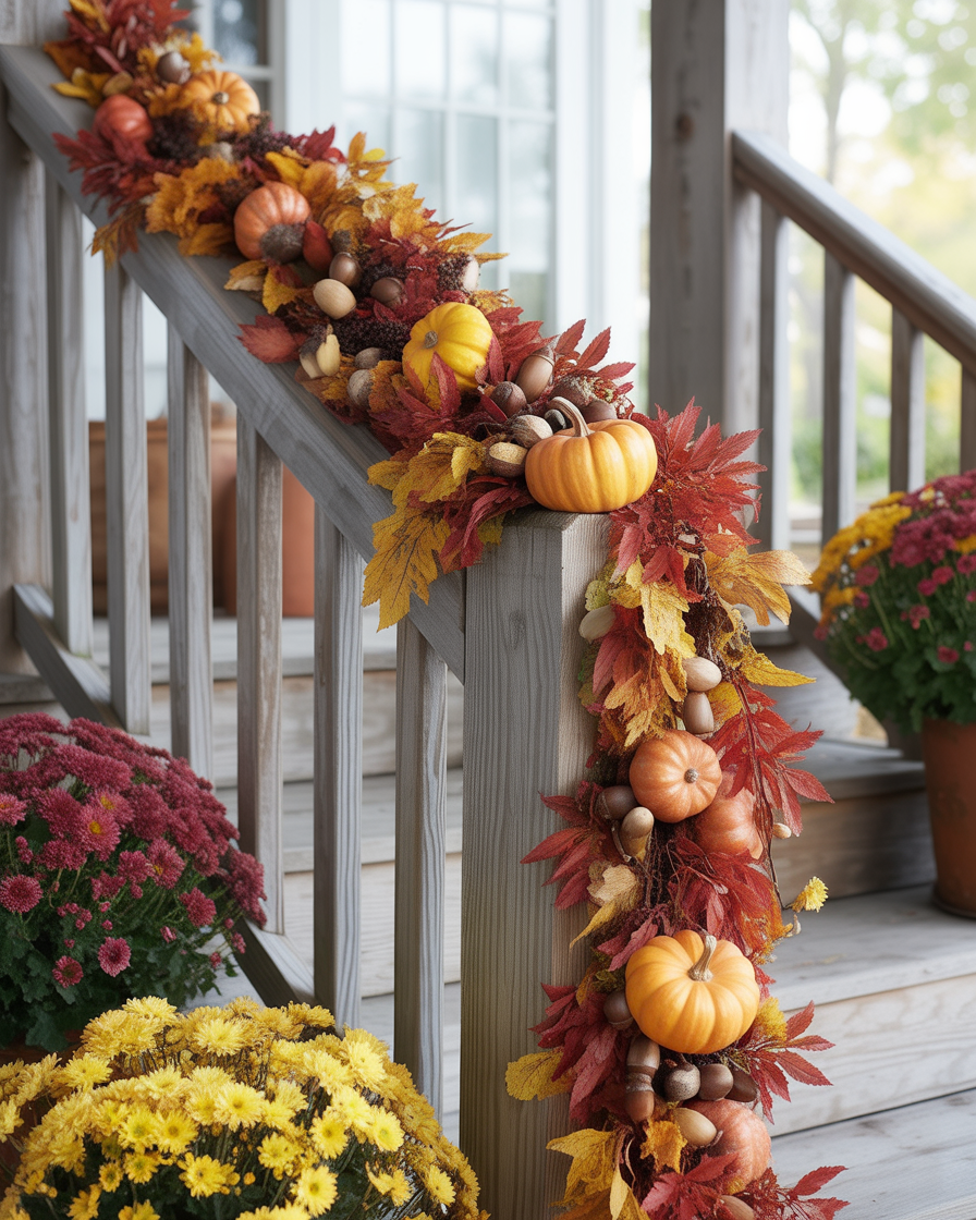 22. Hanging Fall Garland on the Porch Railings