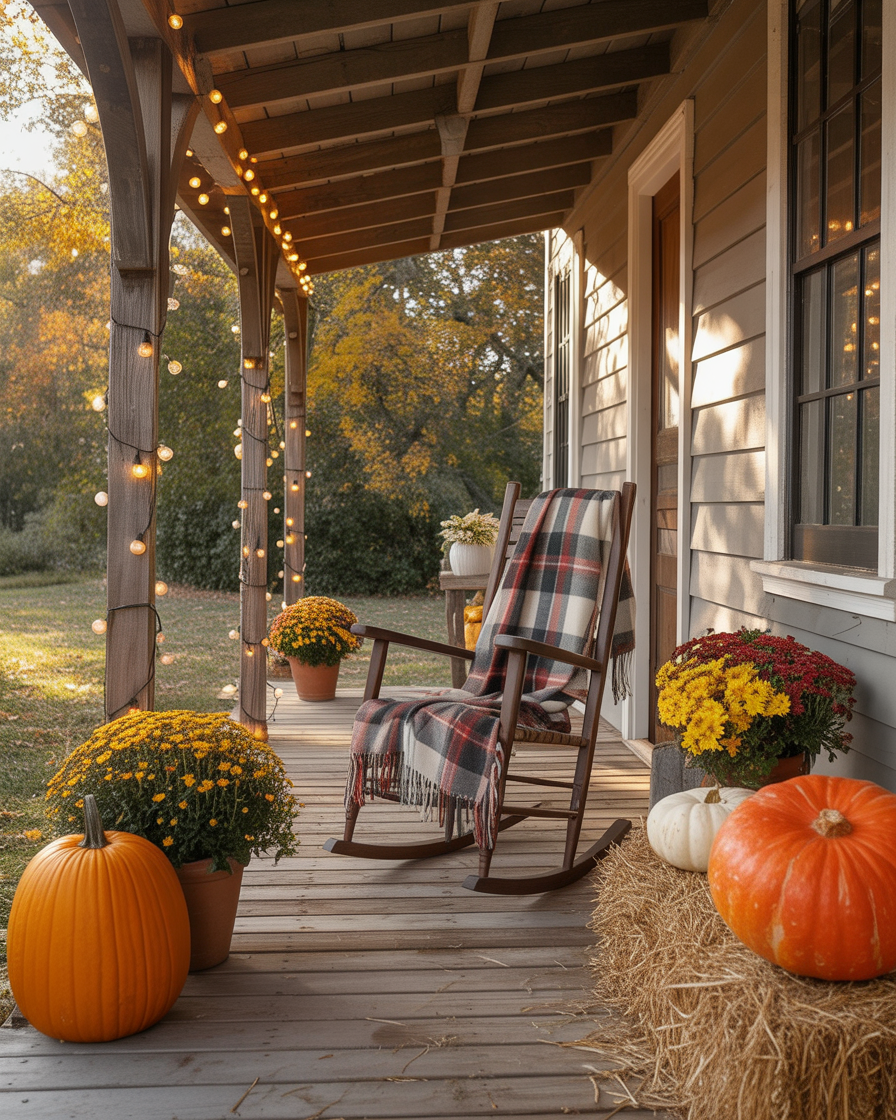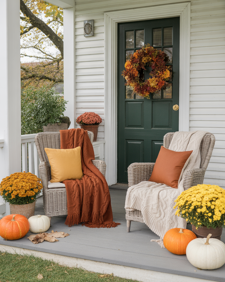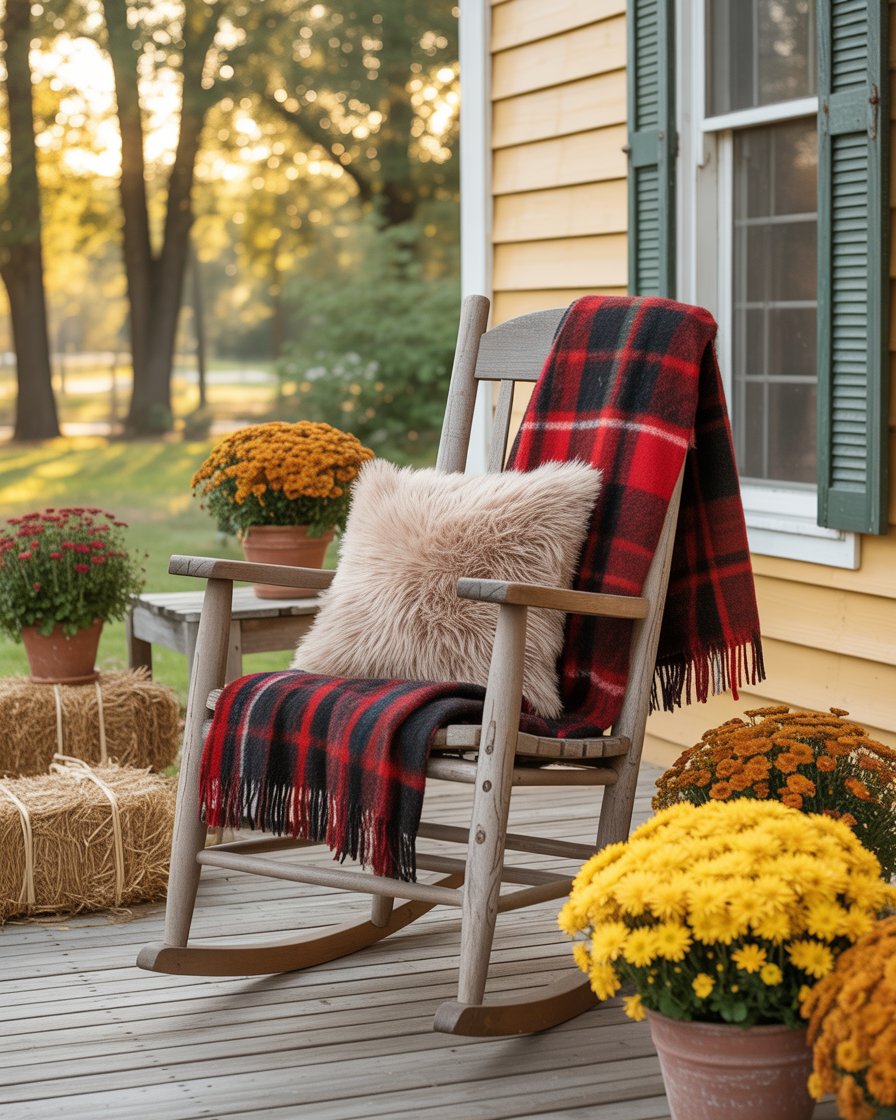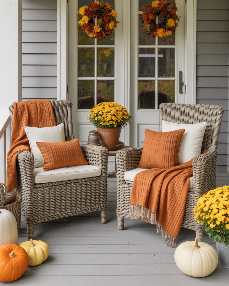 25. Autumn Porch Chairs with Cozy Throws and Pillows