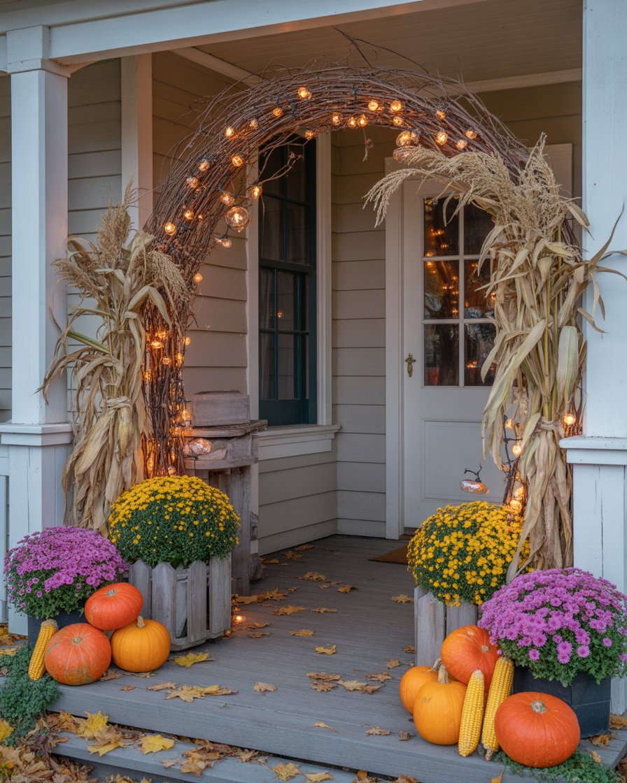 A front porch arch is an excellent way to define the space and make your outdoor entryway stand out. Adding fall touch such as the use of corn stalks and pumpkins hung by a cord and even mums can make an ordinary arch turn into an awesome fall display. Fairy lights can be used to adorn the arch as well making it look especially divine on a chilly fall night. This simple yet striking feature will instantly elevate your porch and create a magical, welcoming atmosphere.