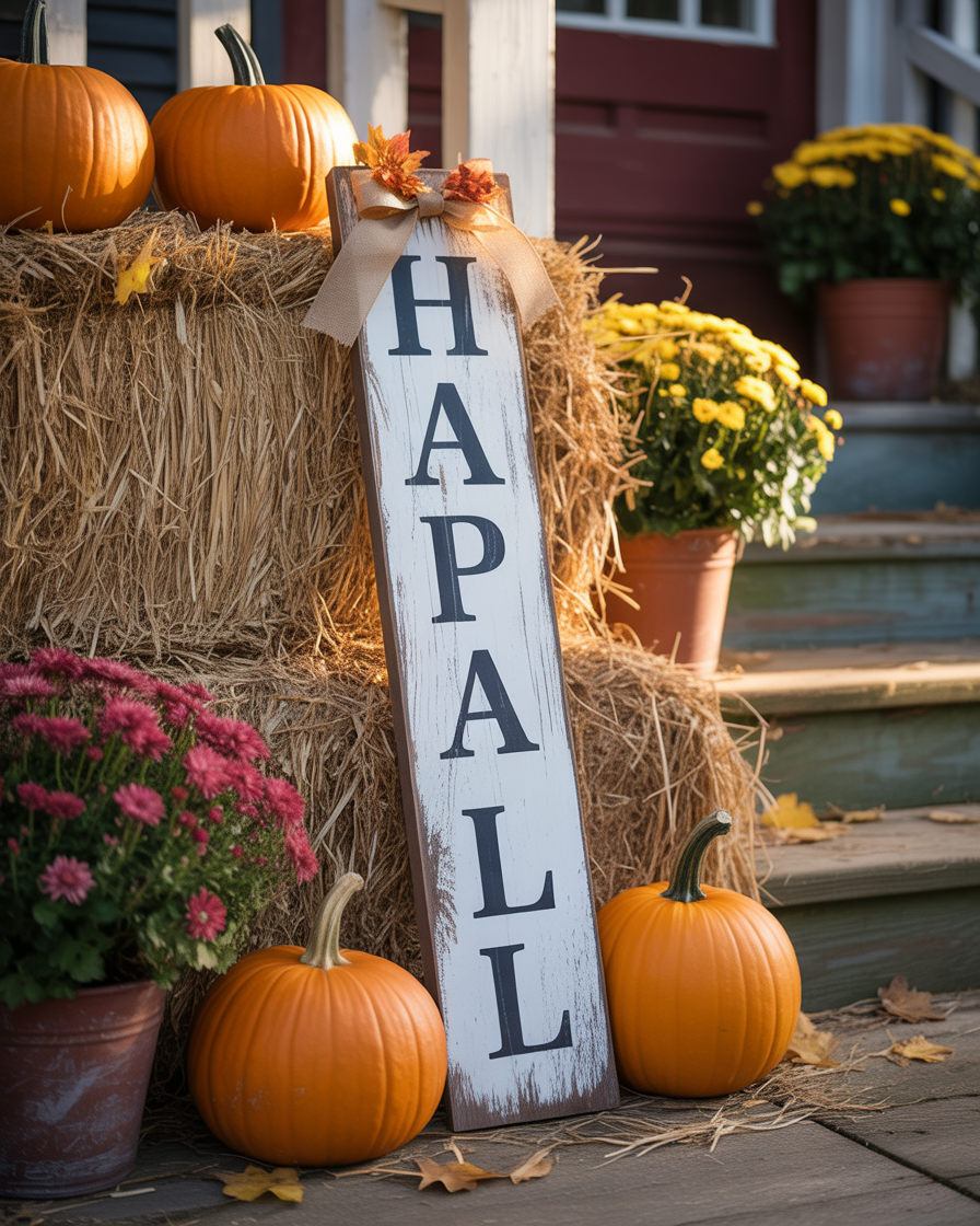 Create DIY fall signs with fun autumnal messages like “Welcome Fall” or “Pumpkin Spice Season.” They are simple to create and you can hang them on your front porch steps or a wall on the front porch. Add a touch of fall by customizing the designs using fall colors and shapes like the pumpkin, leaves and mums. This simple decor idea gives your porch a personal, handcrafted feel that sets a welcoming tone for your guests.