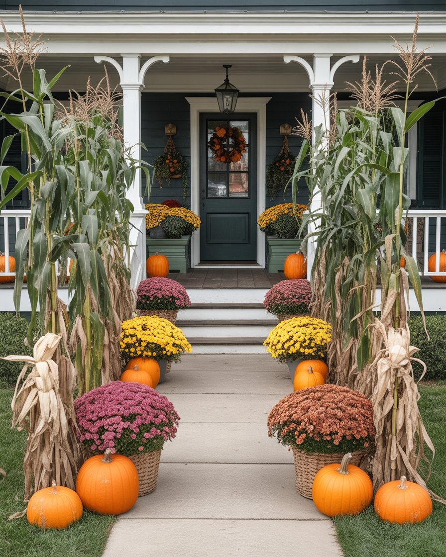 Create a dramatic entrance by lining your driveway or porch front steps with tall corn stalks. The idea of rustic yet striking decor will also go perfectly with fall colors and it will give texture to your yard. You can even decorate the stalks of corn with pumpkins hanging on the stalks and also small mums at the bottom. This idea adds height and depth, transforming your outdoor area into an autumn wonderland as you welcome guests into your home.