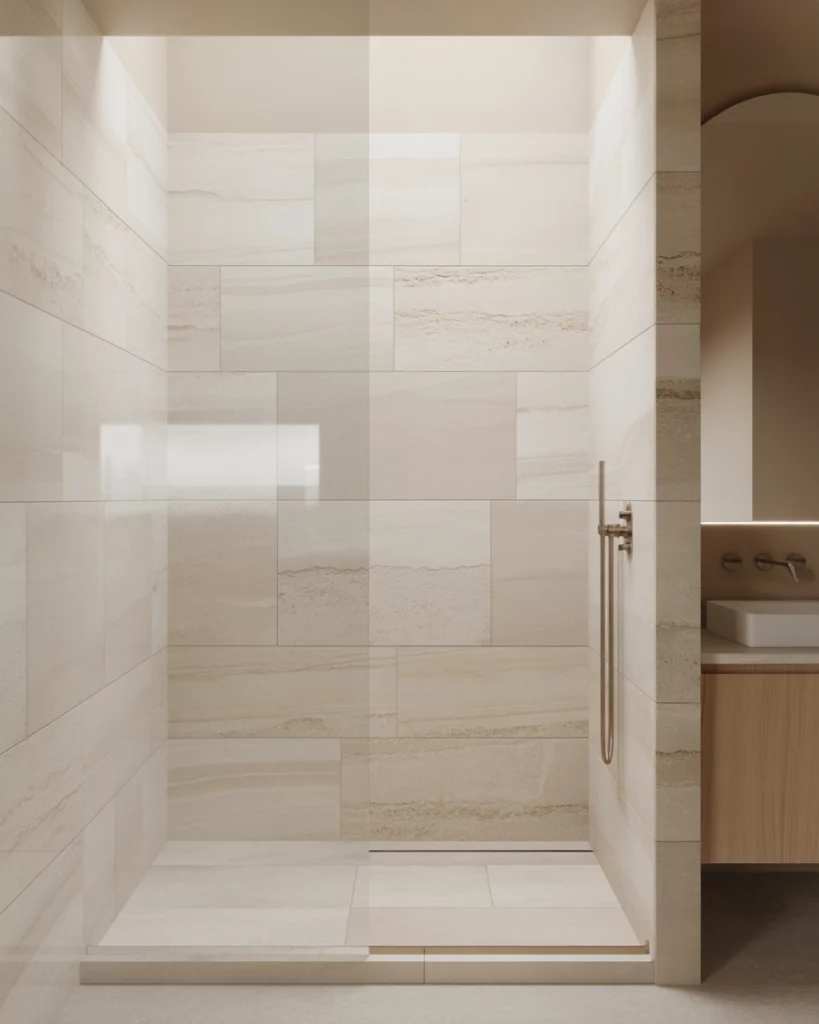 1. Soft Beige Stone Slabs for a Timeless Bathroom