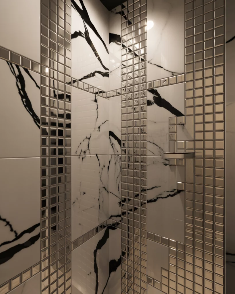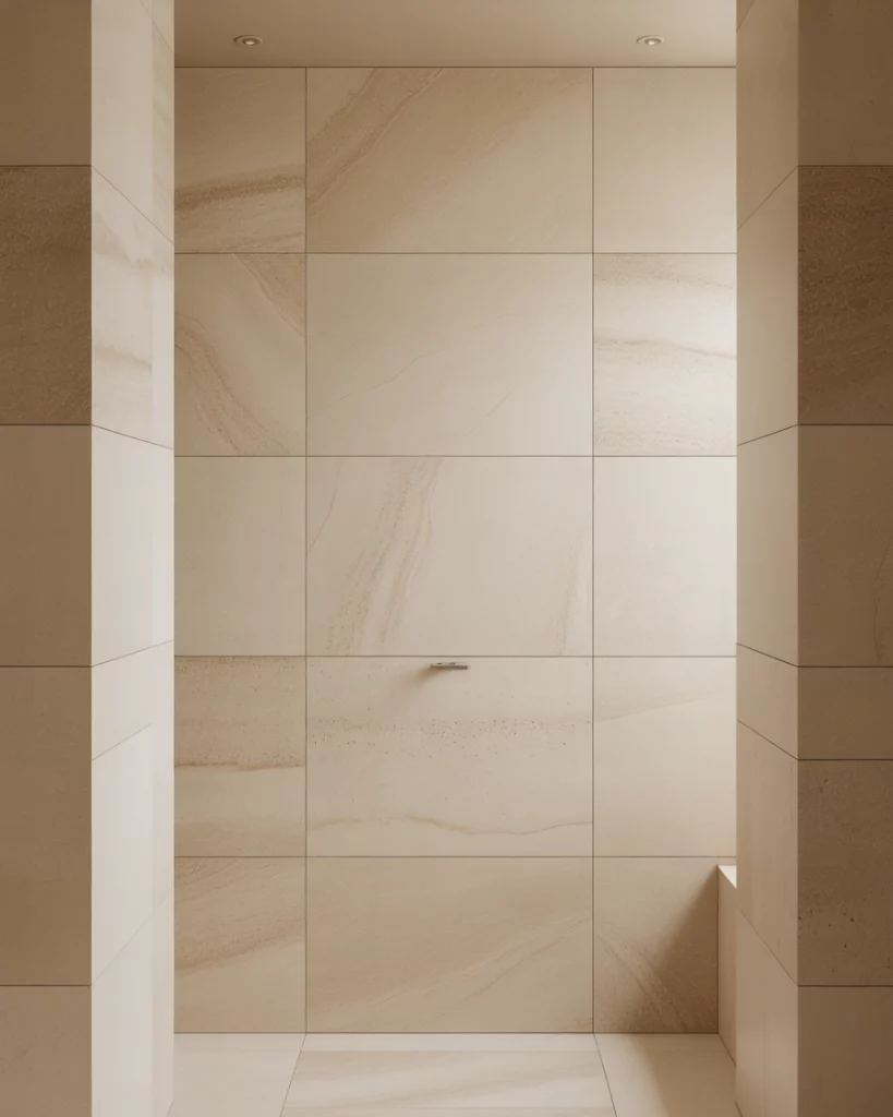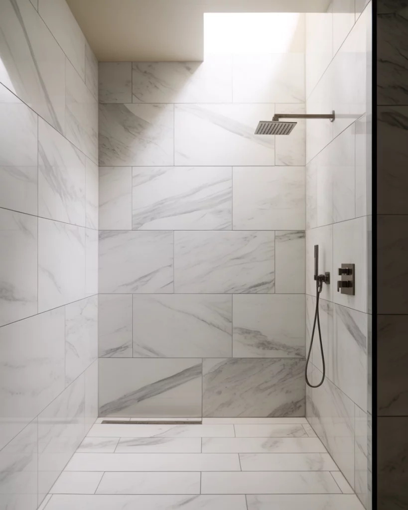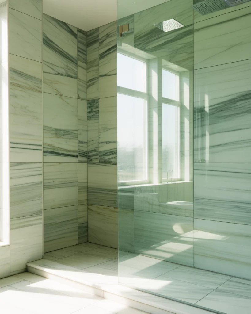 Large format marble-look porcelain slabs bring luxury and minimal grout lines to any bathroom. Ideal for a walk in enclosure or with window shower, they channel elegance without the maintenance of real stone. The veins create a sense of motion, and you can carry the slab across walls and niche to unify the space. Even in a small bathroom, fewer seams help the eye flow uninterrupted, creating a sense of openness.