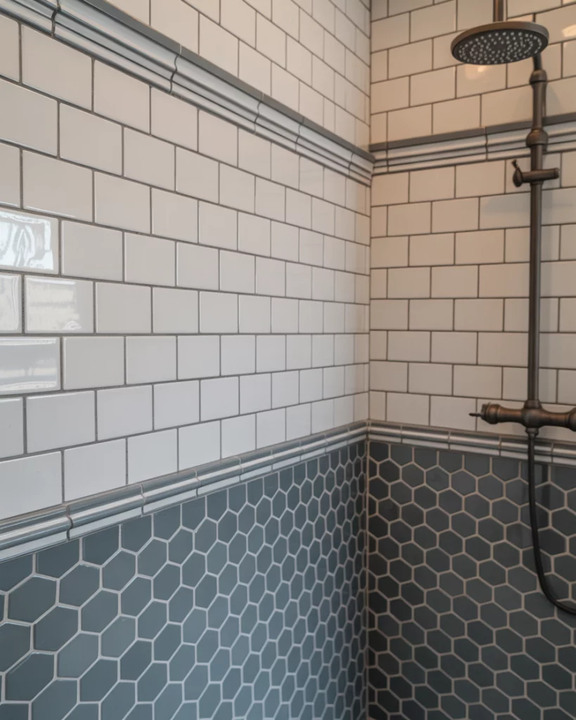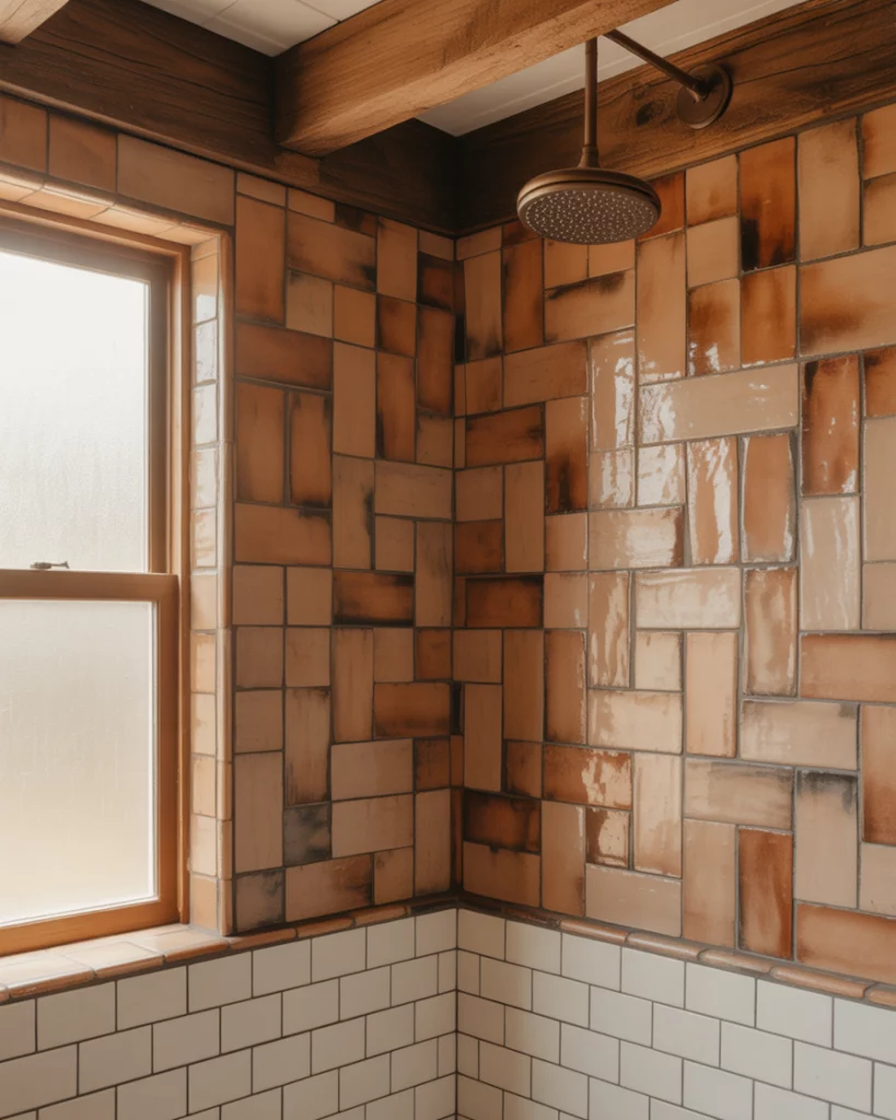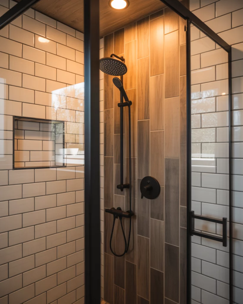 A farmhouse-inspired shower might use white subway tile up to eye level and a soft gray or beige tile above or on the ceiling — a refined two-tone layout. This design works well in a walk in or with tub configuration, including for small bathrooms where visual break adds character without clutter. The contrast lends dimension and maintains a classic, timeless bathroom look. It’s also low-maintenance if you choose quality porcelain.