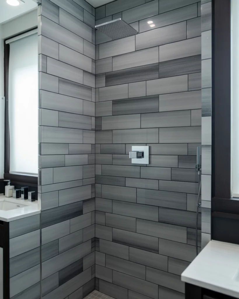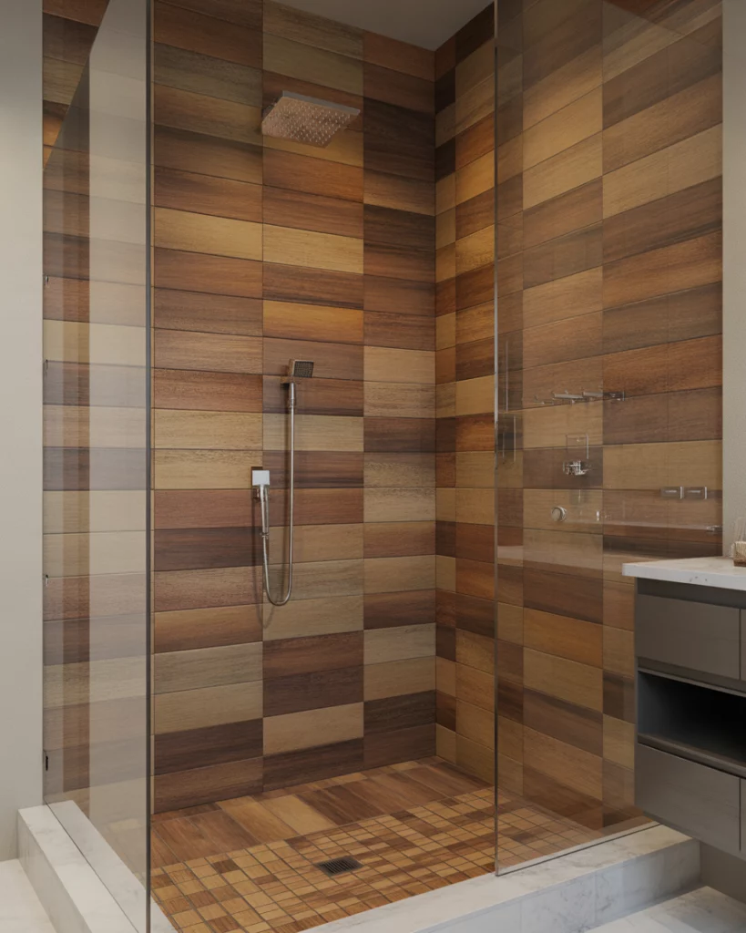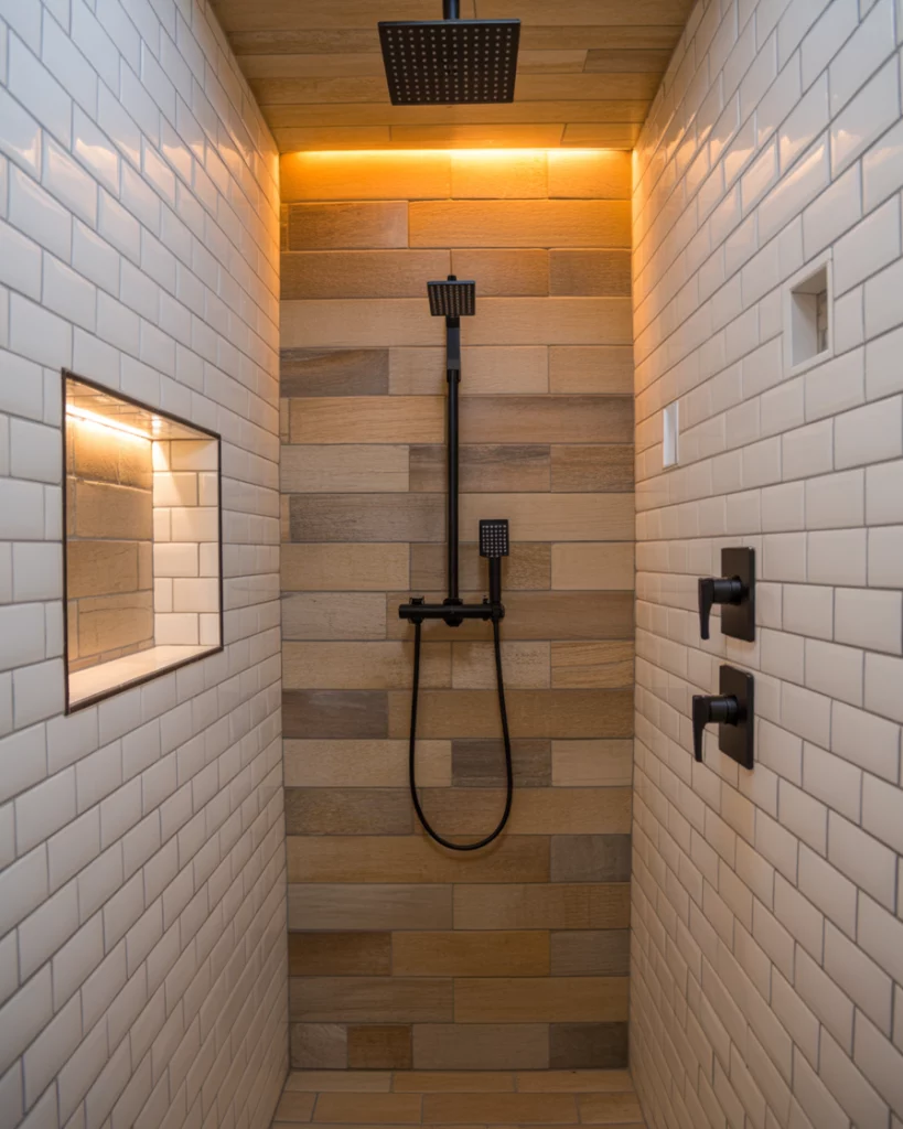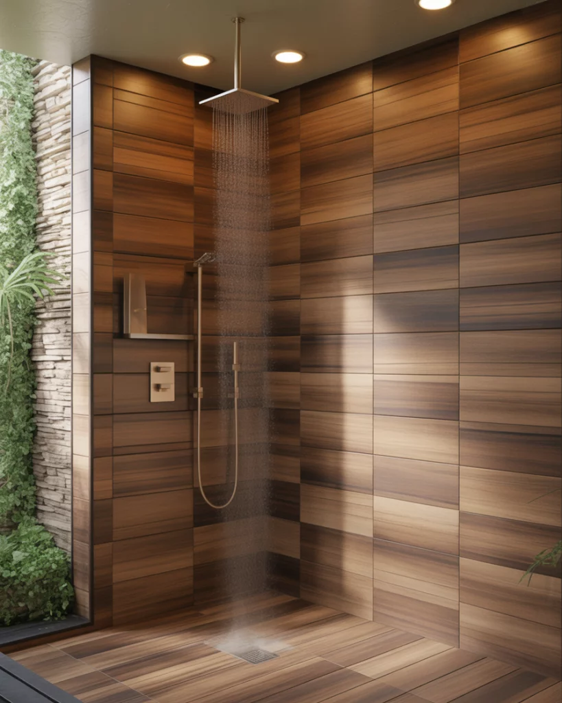 A wood-look tile shower evokes the comfort of a spa retreat. The natural grain, whether in beige, grey, or dark walnut tones, gives warmth without compromising water resistance. Perfect for a walk in master suite or with tub setup, these tiles create the illusion of wood while staying low-maintenance. Combine them with matte black fixtures for contrast or white accents for balance. This trend blends nature with modern practicality — a timeless favorite.