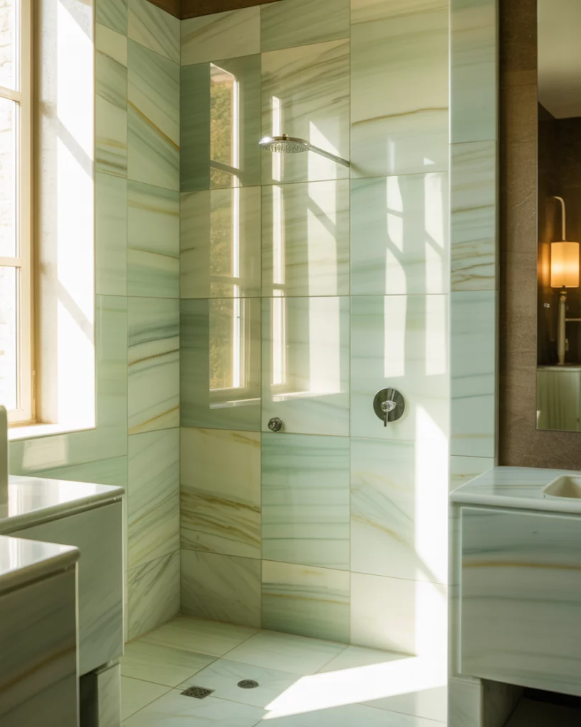 In 2026, green marble or marble-look porcelain brings luxury with a natural soul. Its subtle veining and serene tone transform a bathroom into a calm retreat. Pair with white or beige accents for a balanced timeless bathroom palette. Works beautifully for small bathrooms too, especially when backlit or paired with window light. This trend reflects eco-luxury — calm, grounding, and sophisticated.
