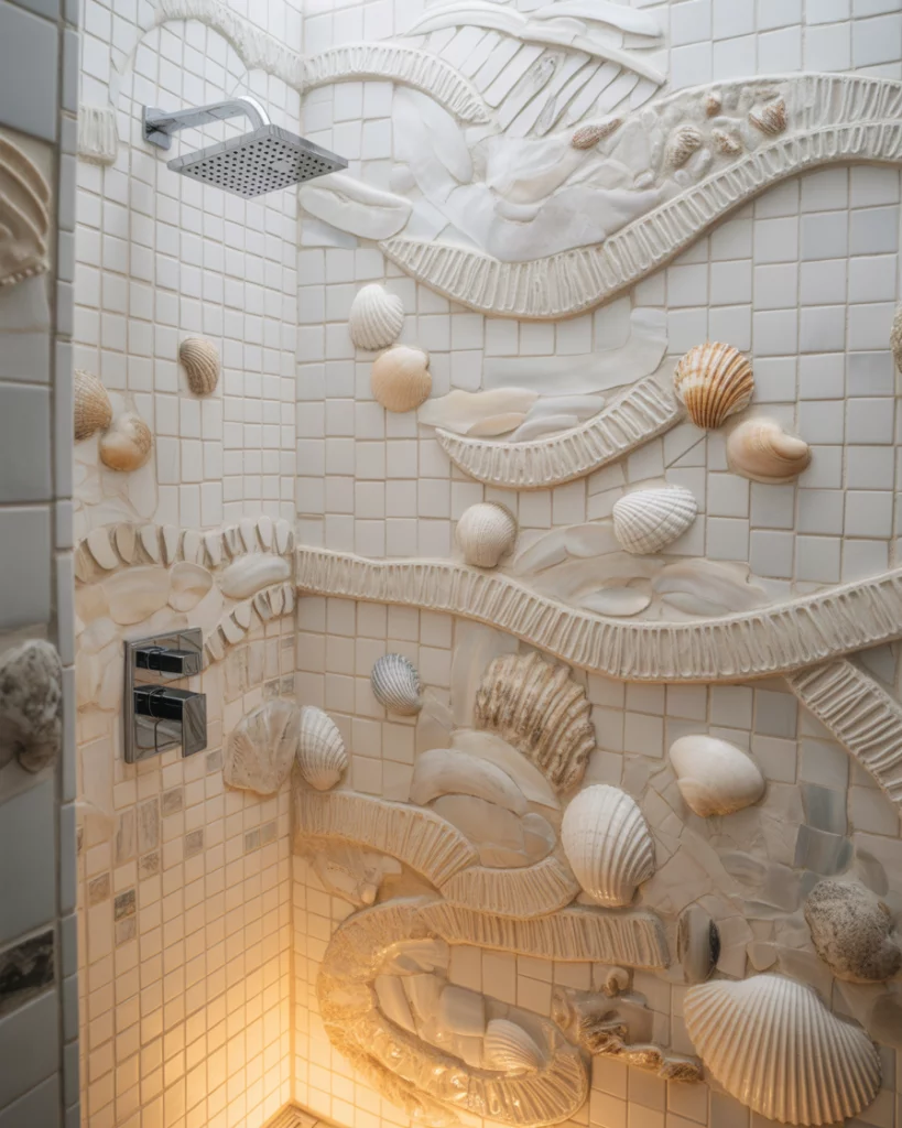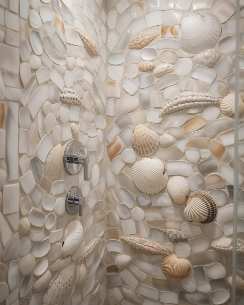 A coastal mosaic made of pearly shells or iridescent tiles instantly brightens your bathroom. Ideal for a walk in or with tub setup, this shimmering finish reflects light beautifully, especially in small bathrooms. Combine it with white grout and sandy beige tones for that seaside calm. Add wicker baskets or driftwood accessories to complete the look. It’s breezy yet timeless, like a summer morning on the coast.