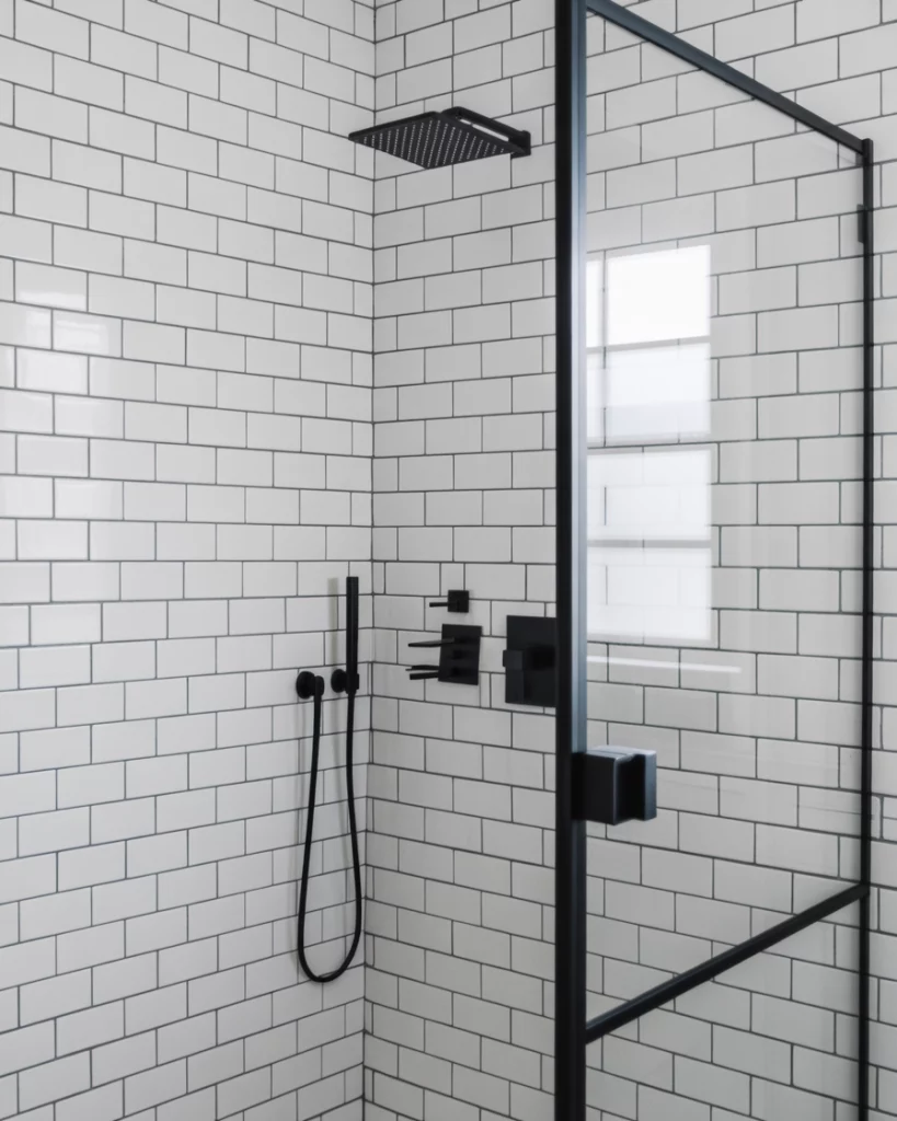 For lovers of modern design, clean black grout lines against white tiles create striking geometry. This black and white contrast turns even a compact walk in shower into a bold statement. Add grey or dark fixtures for continuity, or wood shelving for warmth. This look works in urban lofts and small bathrooms alike — sharp, graphic, and unmistakably classic.