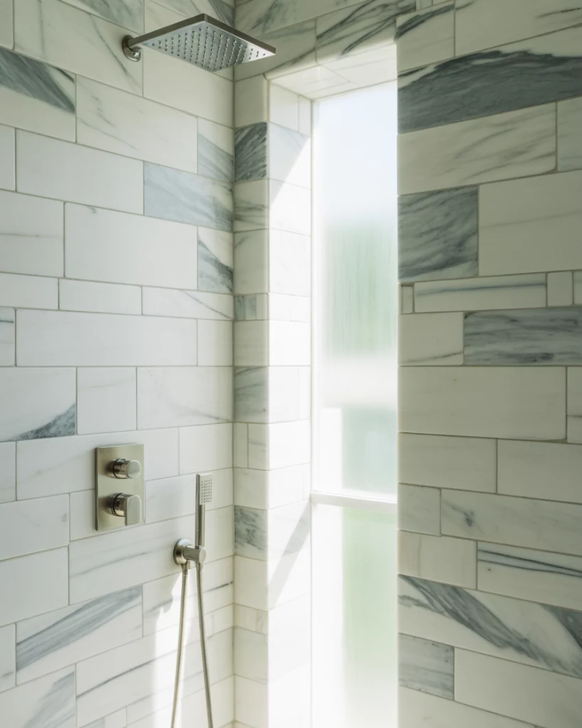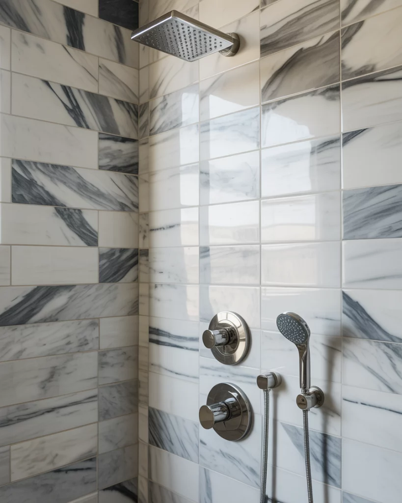 Combining gray and white marble tiles gives a soft, cloud-like ambiance. Perfect for a walk in shower with window, this palette plays beautifully with natural light. The gentle contrast keeps things classic and sophisticated, while the variation hides soap residue, making it low-maintenance. Add chrome or black hardware for a modern finish.