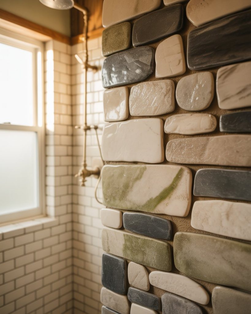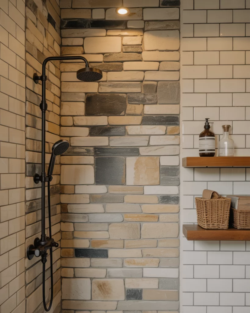 Bring the outdoors in with textured rustic stone tiles. Their uneven surfaces add tactile depth, ideal for walk in master showers or farmhouse spaces. Use warm beige or gray tones to create a cozy, timeless retreat. Paired with wood benches and soft lighting, it evokes a mountain spa. This aesthetic feels authentic and inviting — low-maintenance when sealed properly.