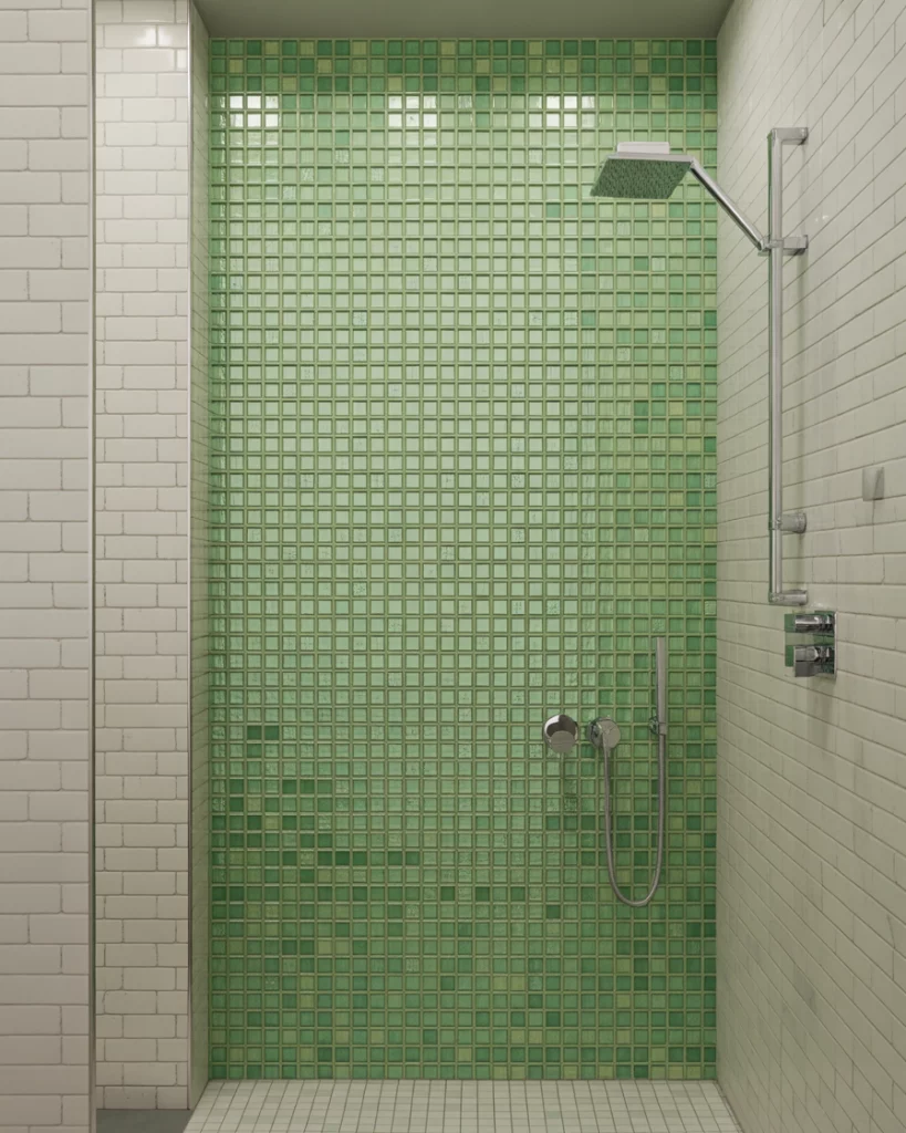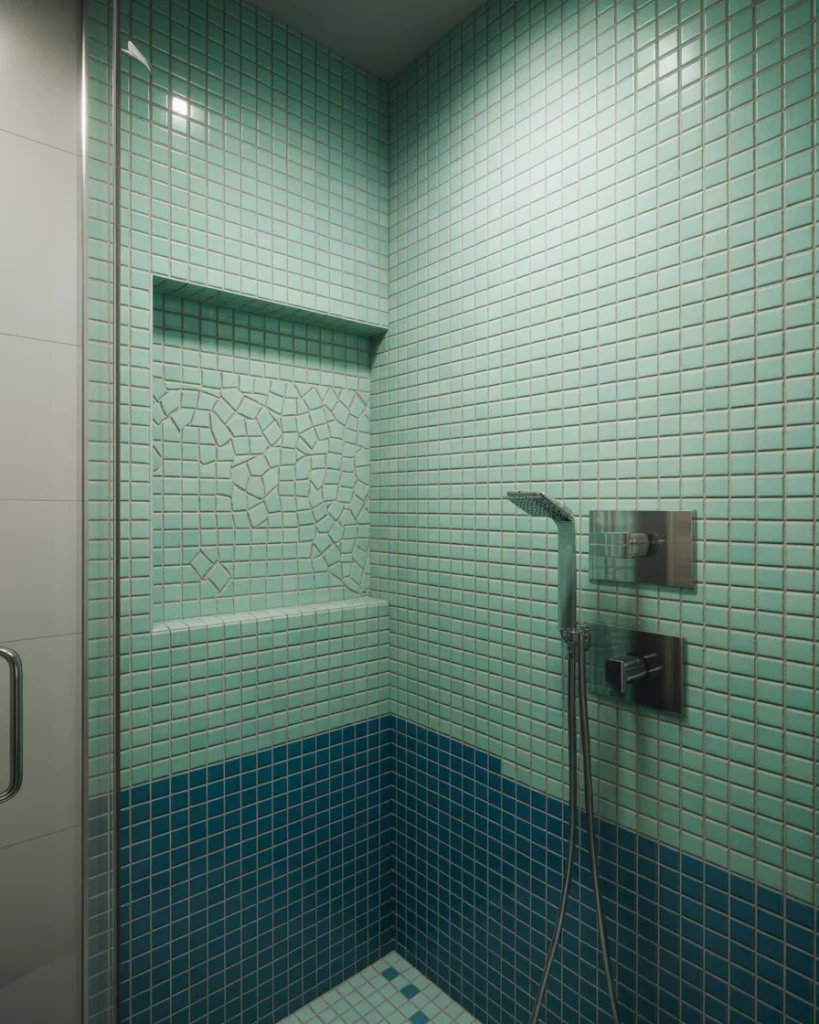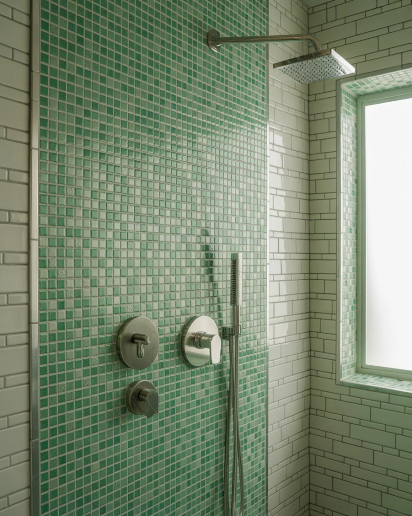 Incorporate green glass mosaic tiles as accent walls or niches to evoke spa and coastal energy. Use them in a walk in master or above a tub for a refreshingly natural touch. Pair with gray, white, or beige field tiles for balance. The glass catches light, adding vibrancy. In a small bathroom, a vertical strip of green mosaic leads the eye upward. This hybrid accent keeps things luxury yet breezy and modern.