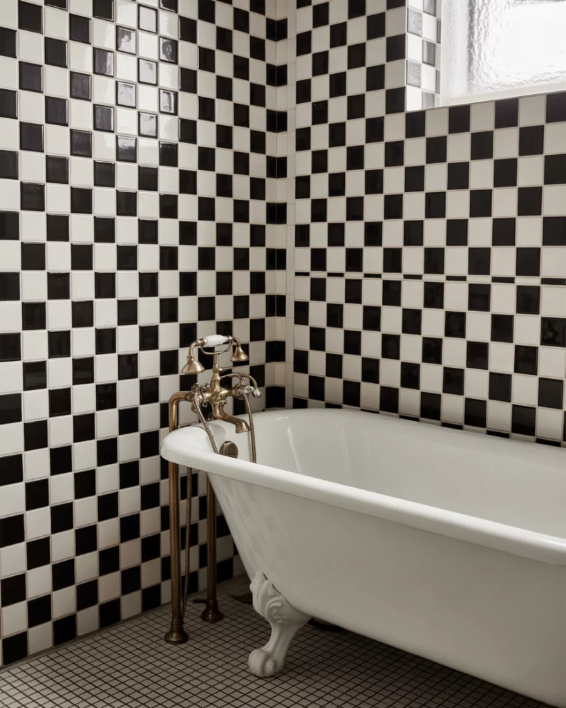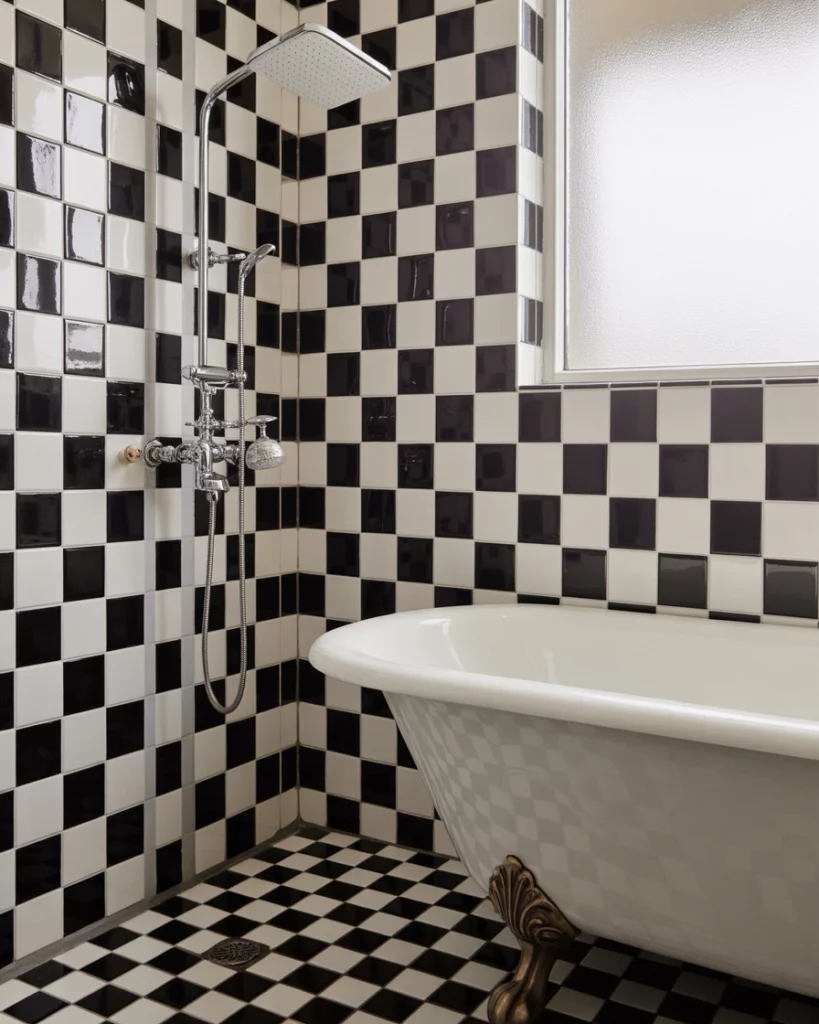 The classic checkerboard pattern is making a chic comeback in bathrooms. Using black and white or gray and beige combinations, it creates retro energy that feels both timeless and playful. This works beautifully in a walk in master or with tub space. Add gold fixtures or a clawfoot bathtub to channel mid-century glamour.