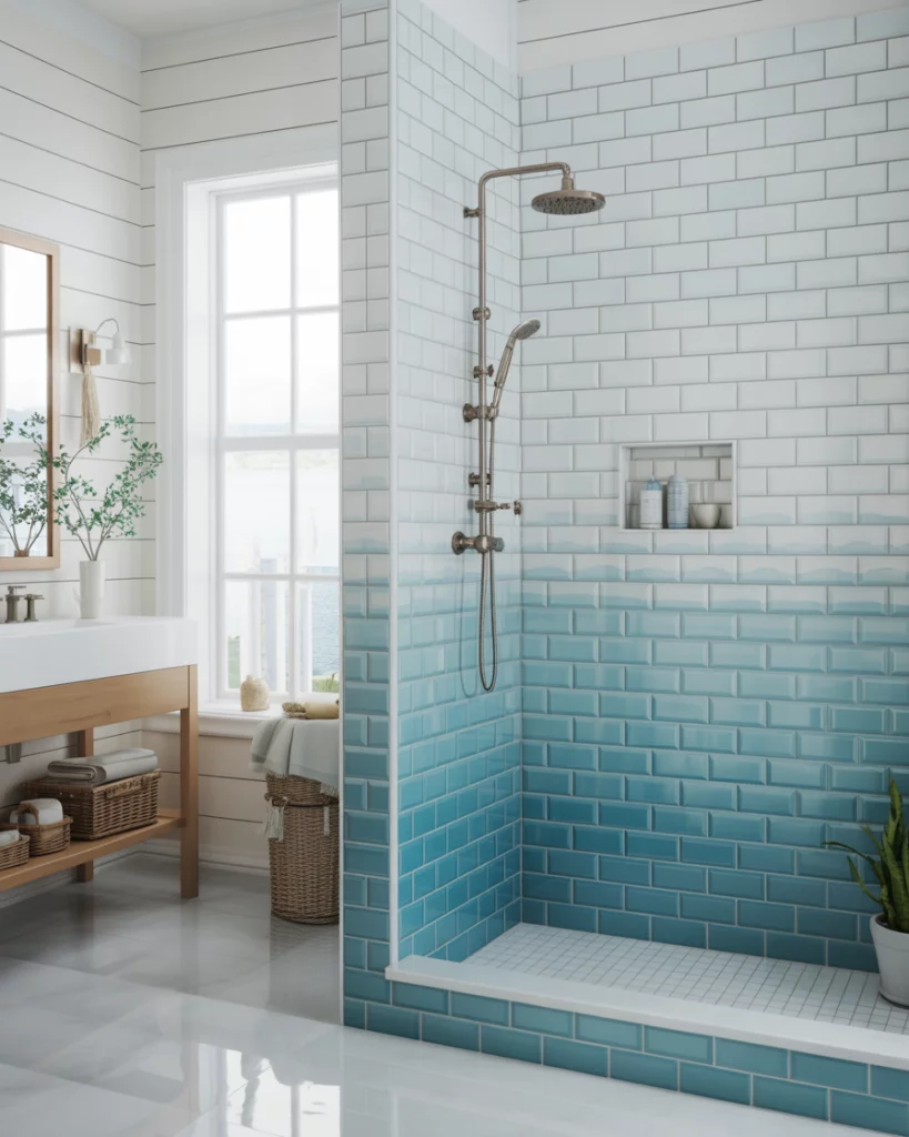 For a dreamy, coastal-inspired retreat, blue ombre tiles fade from deep navy to pale aqua, bringing fluid motion to your bathroom walls. This design works beautifully in a walk in or with tub setup, evoking ocean serenity while staying modern. Paired with white grout and neutral finishes, the look feels airy and timeless. Ideal for small bathrooms seeking color without chaos.