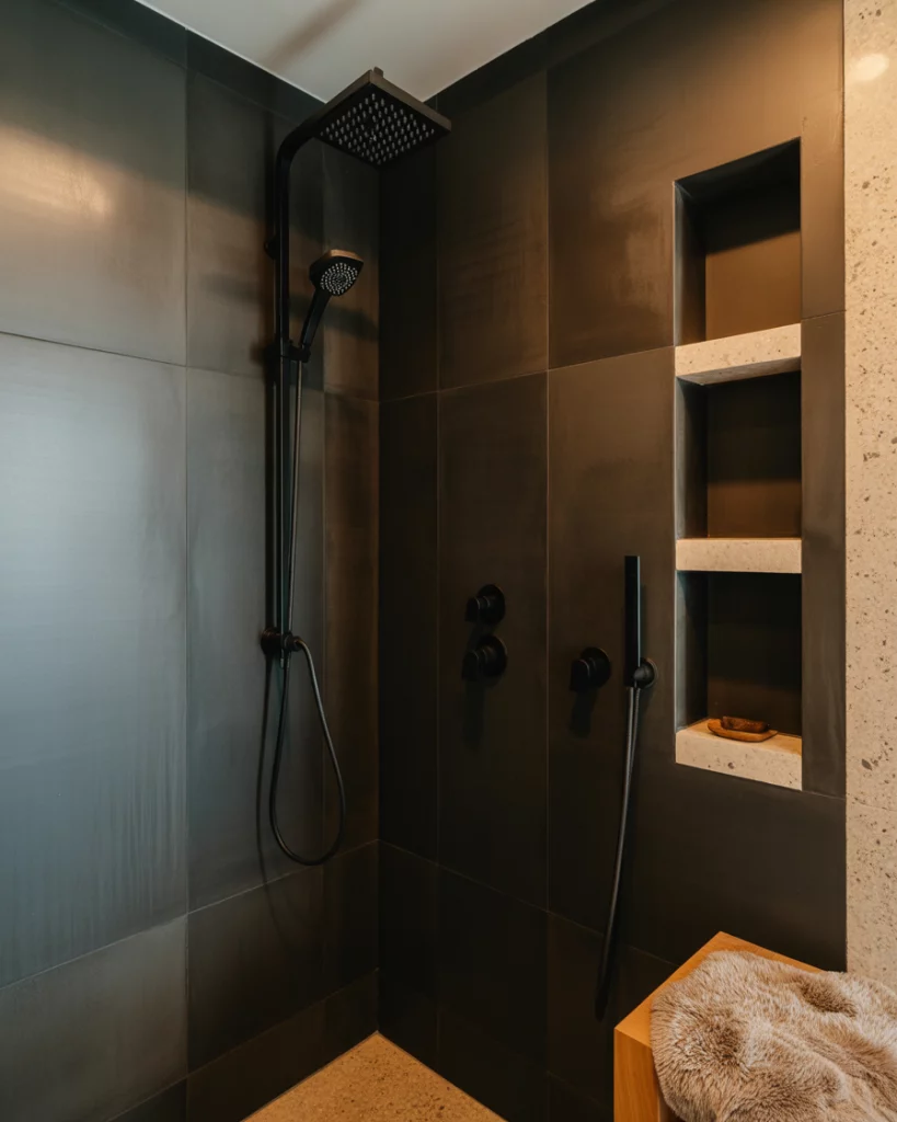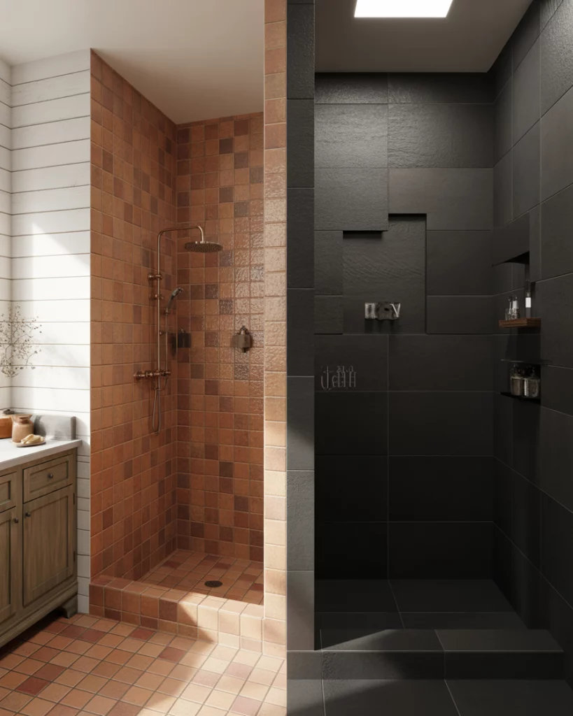 A dramatic, dark black slate or porcelain tile can transform a shower into a sleek, moody retreat. This works especially well in a walk in design or with window where light plays across texture. For a timeless bathroom, contrast it with crisp white walls or grey accents. Because dark tiles can show water spots, choose matte or textured finishes for low-maintenance upkeep. Balance with lighting and lighter accessories to avoid a cave-like feel.