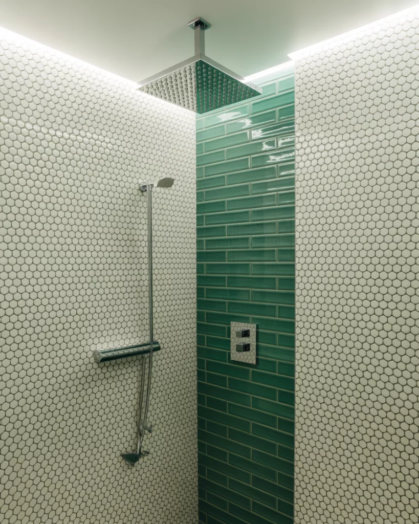White penny tiles bring texture and playfulness to any small bathroom. Add a vertical green accent wall or niche for freshness — the combination feels clean, modern, and slightly retro. Great with tub or walk in designs, this idea adds subtle charm without overwhelming. It’s budget-friendly, low-maintenance, and forever classic.