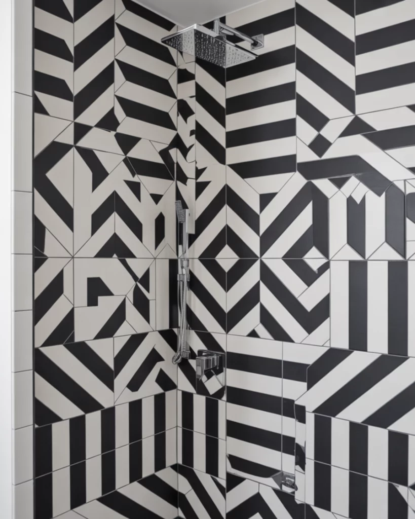 A black and white geometric tile — whether hexagonal, chevron, or Moroccan-inspired — delivers a striking visual in a classic or modern bathroom. In a walk in shower or above a bathtub, it introduces drama while remaining timeless. Because the palette is restrained, the complexity of the pattern doesn’t overwhelm. Use mostly white field tiles to balance, and reserve the pattern for a feature wall or niche.