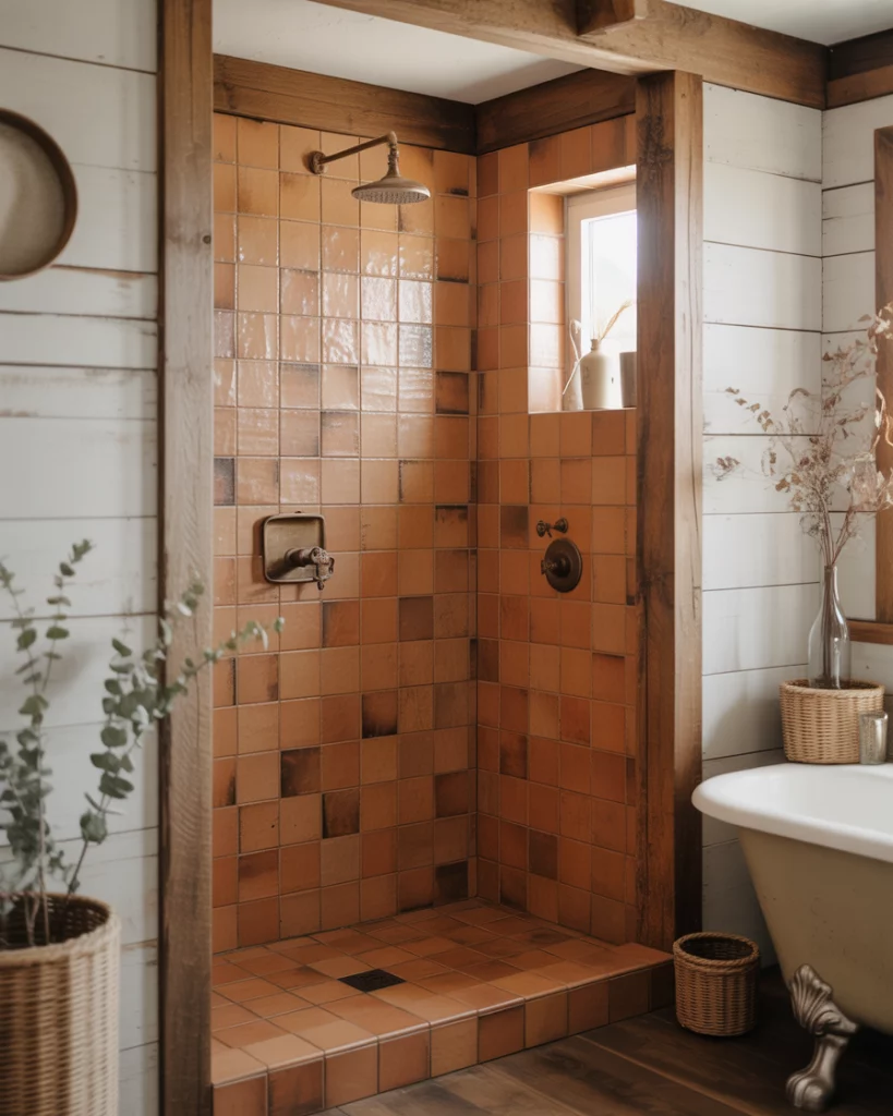 For a cozy, organic vibe, rustic terracotta or sandstone tiles (matte finish) can warm up a bathroom. They lend a farmhouse or Mediterranean feel, especially when paired with warm wood accents or black metal trim. In a walk in master shower or tub combo, the rustic tones bring texture and depth. Choose honed finishes (not glossy) to avoid slipperiness. As a low-maintenance pick, sealed porcelain versions mimic the look without fragility.