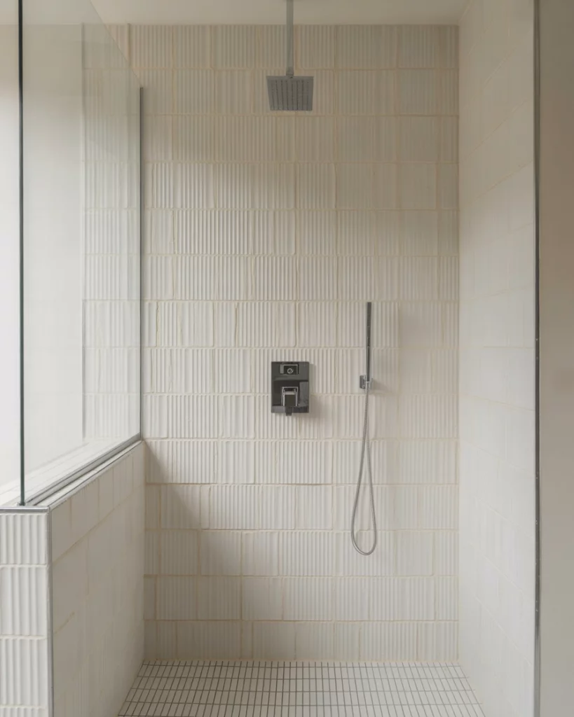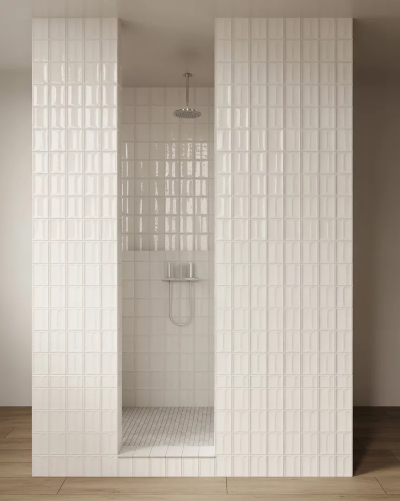 Nothing feels more classic than crisp white tile — but in 2026, texture is key. Use subtly undulating, ripple, or 3D tiles to add depth and interest in a walk in or combined bathtub-shower space. Especially effective in a small bathroom, the brightness visually expands the space. White remains a timeless choice and a perfect backdrop for colorful accents like blue, green, or brass. Choose large tiles to reduce grout.
