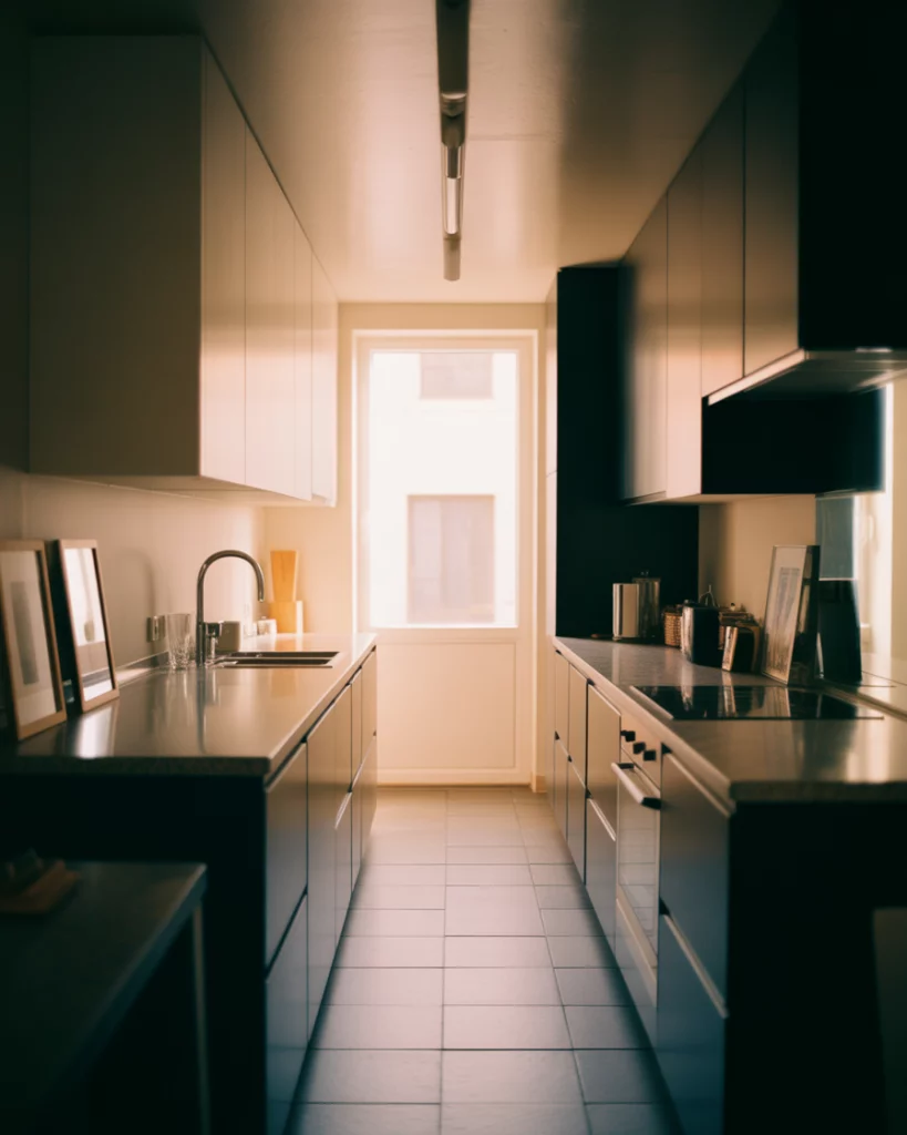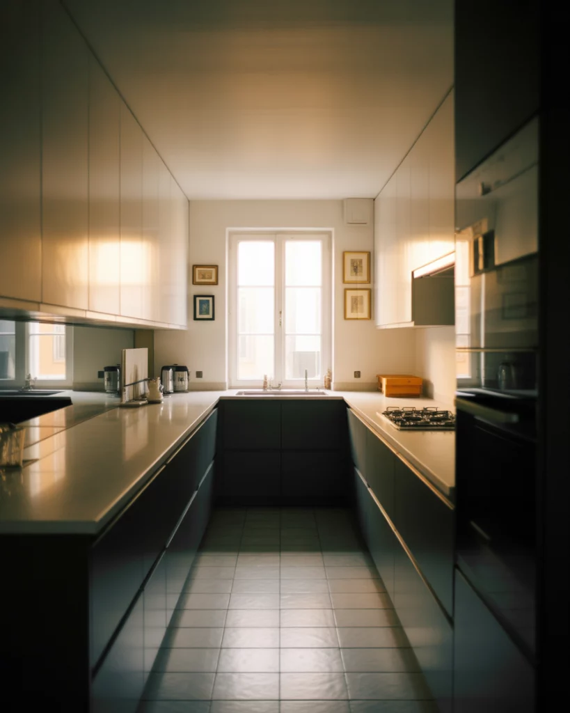 Gallery kitchens are perfect when you have a compact space and love the dramatic black and white theme. Just combine the narrow cabinetry with the matte surfaces and use contrast through ideas like decorative elements, flooring, and the touch of contrast, and you’re all set. The theme appears like it has come straight from an art collection and does not overwhelm small apartments and condominiums.