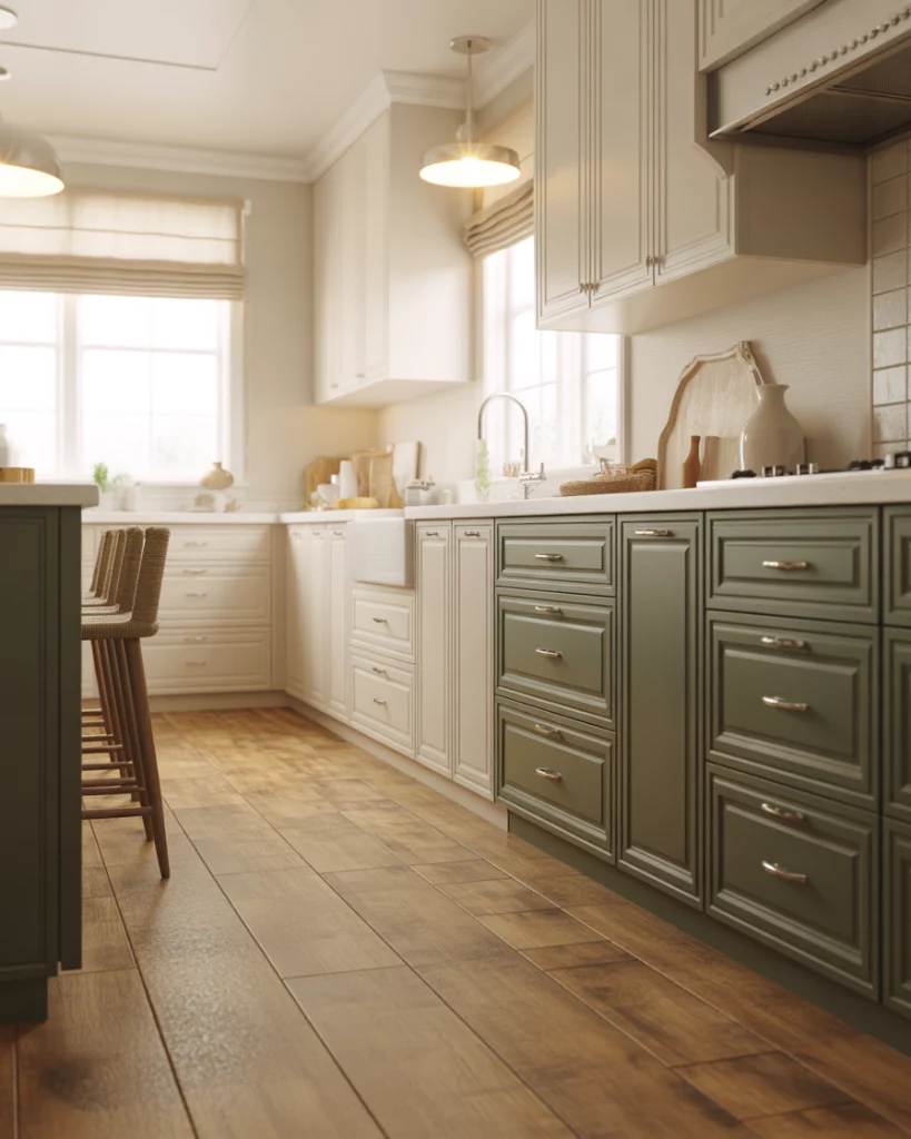 What would make your monochromatic kitchen slightly different and still make the theme work? The use of contrasting tones in the cabinetry would always make the space interesting. The contrast would work well when paired with warm wood floors, ideas in the interior, and other ideas in the cabinetry.
