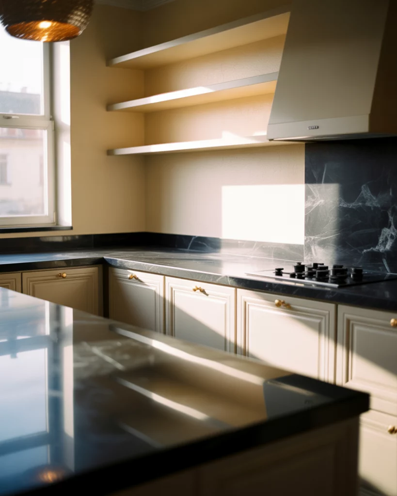 5 Sleek Black Cabinets With Light Stone Backsplash
