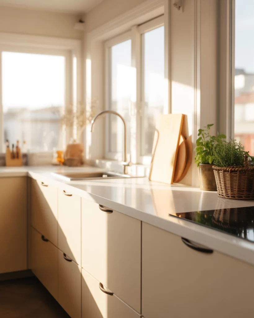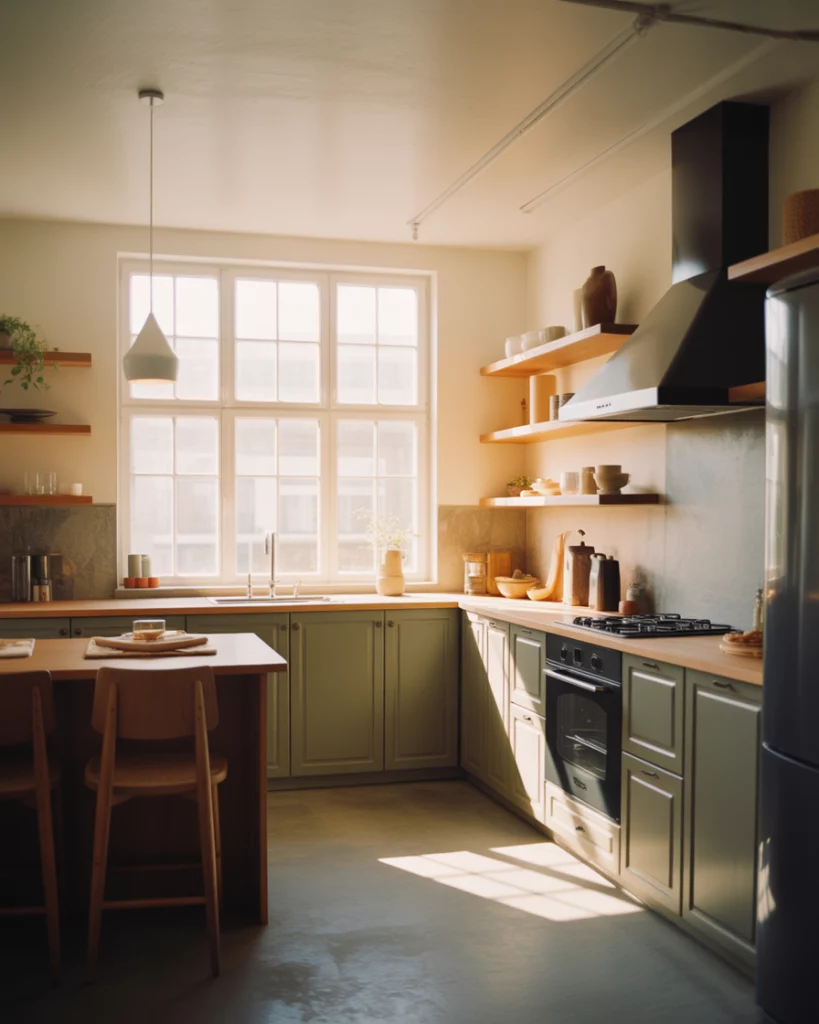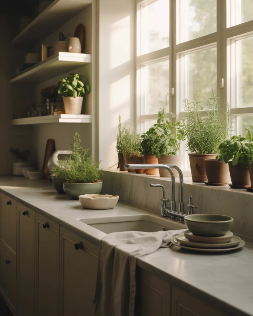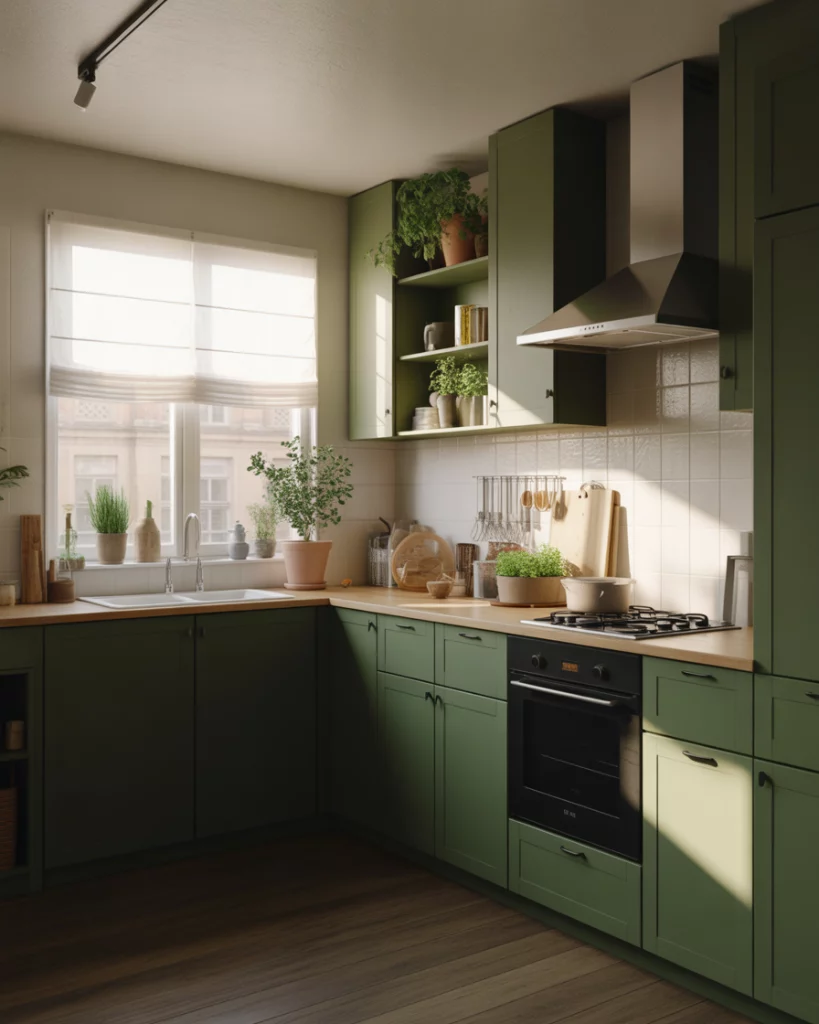 Using different tones in the kitchen by adding greenery provides an excellent contrast and works well in kitchen design ideas. The effect can be achieved using ideas like redecorating with green, using green accessories, and using other ideas on the décor. The effect works well and provides an excellent contrast.