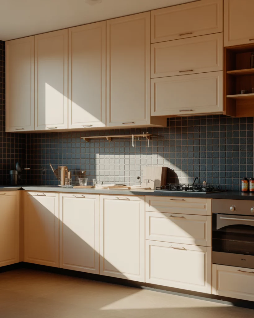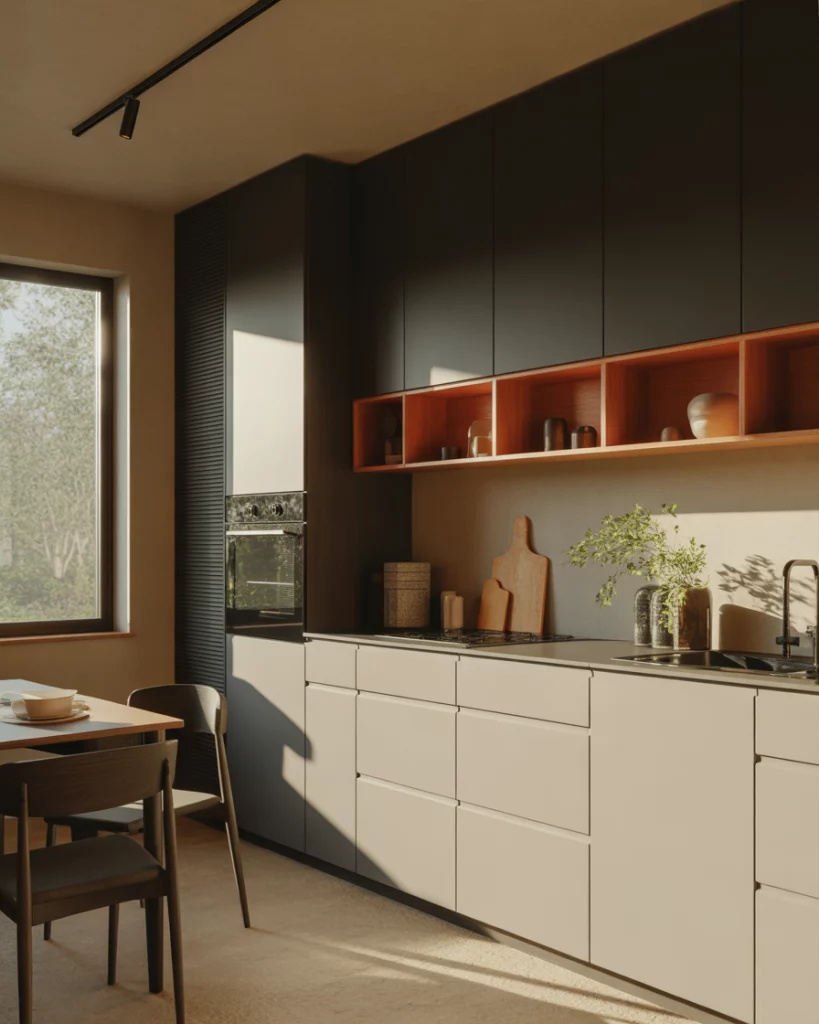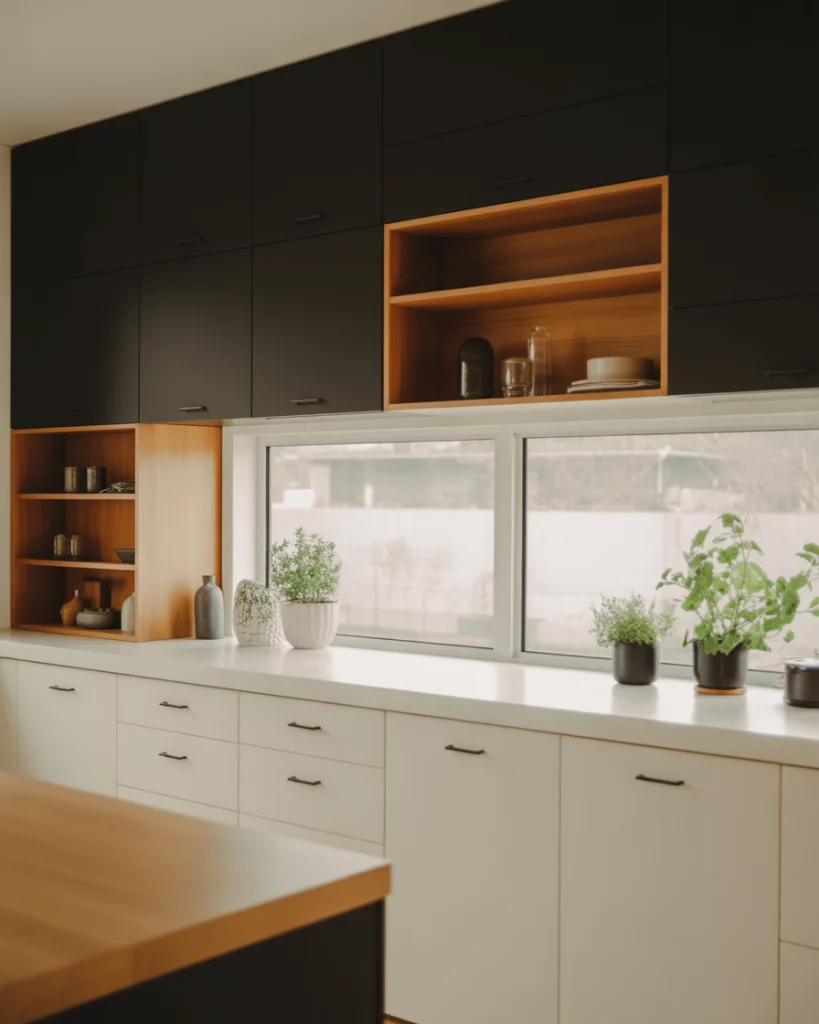 When you like classic themes and want a fresh 2026 twist, you can begin with classic lower cabinets in the dramatic black theme and an all-white wall. The combination works incredibly well when you combine it with pieces like wood accent ideas, cool grey tones, and high-end accessories that prevent the space from looking too cold.